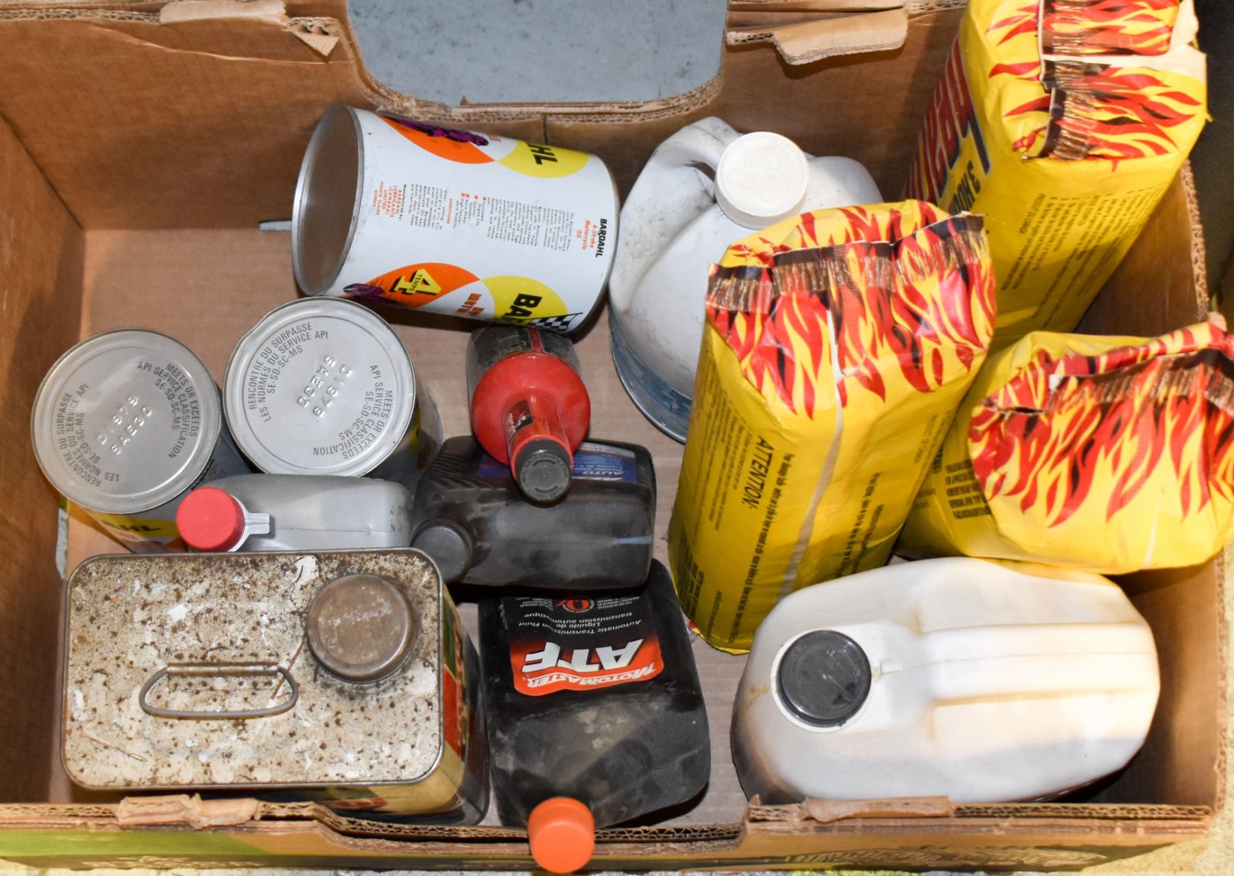 UNCLAIMED BOX OF ASSORTED OILS AND FIREWOOD