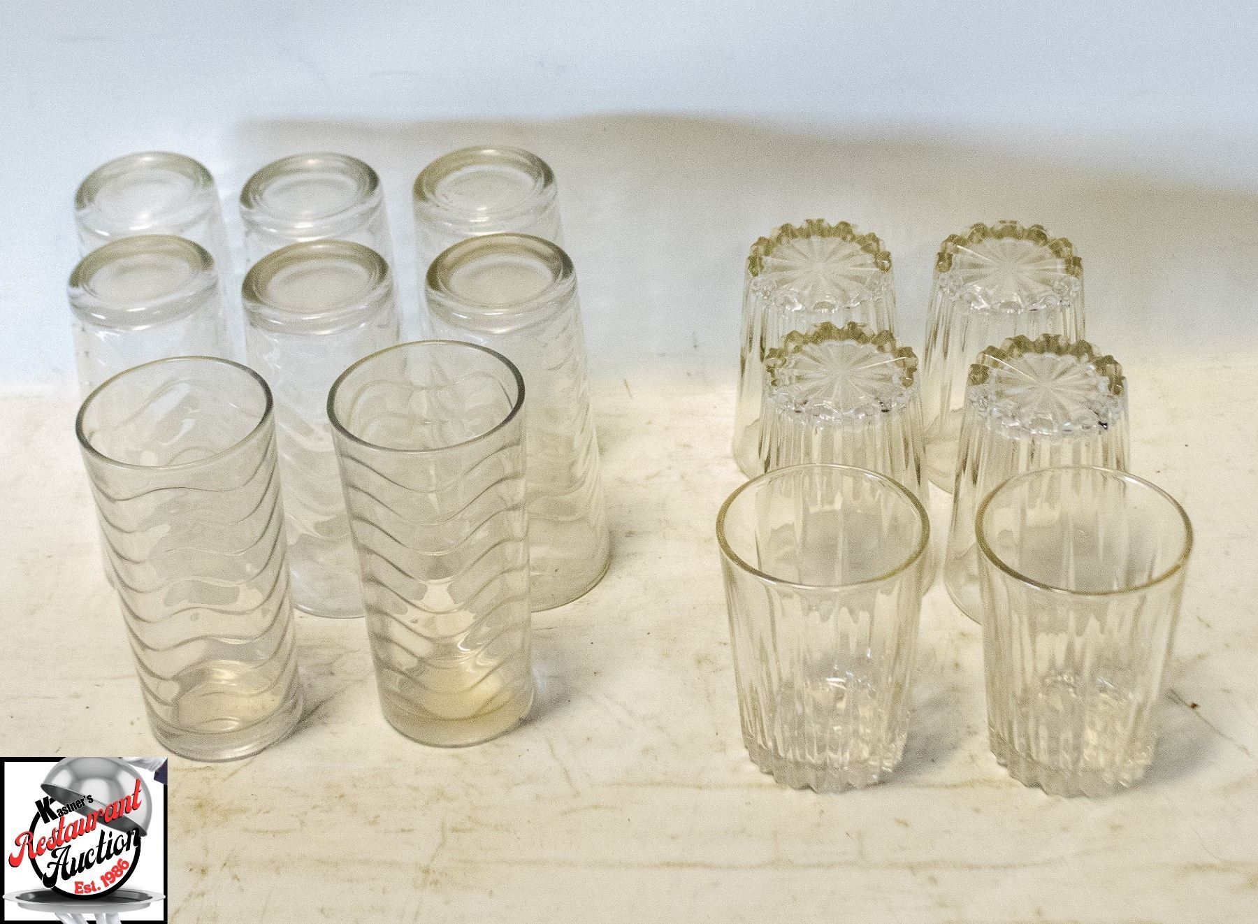 6 SHORT CLEAR WATER GALSSES, 8 SMOOTH COLLINS GLASSES