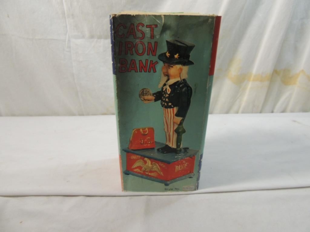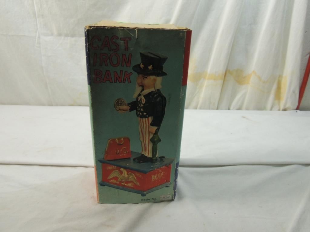 CAST IRON UNCLE SAM BANK VITNAGE BANK IN ORGINAL BOX, COLLECTIBLE AS SHOWN SEE PHOTO FOR MORE DETAILS.