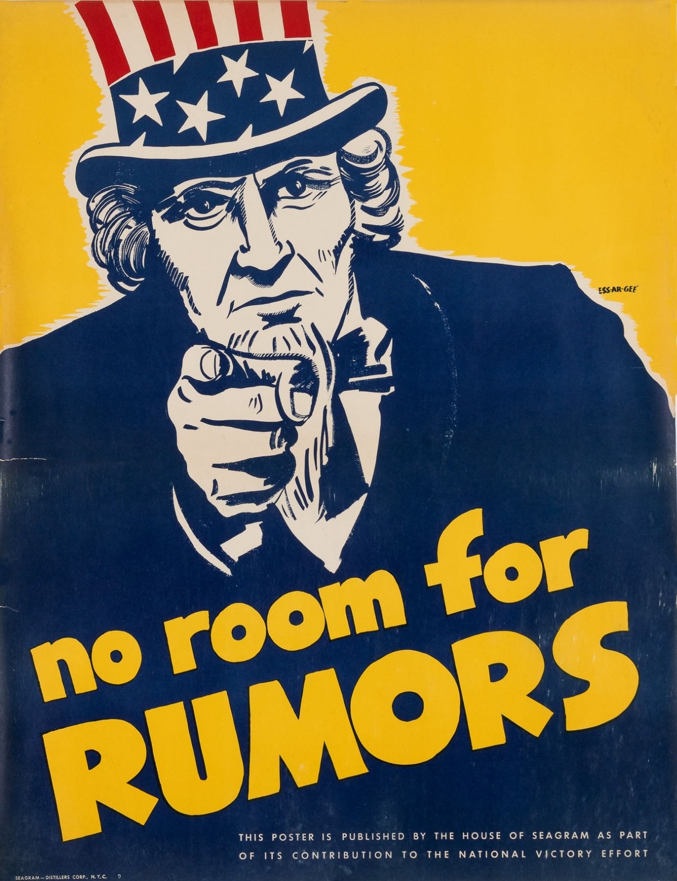 'No Room for Rumors', artwork by 'Ess-Ar-Gee', likely Seymour Golf, Seagram-Distillers Corp., published by the House of Seagram 'as part of its contribution to the National Victory Effort', 1942, 21 x 28 inches. One 1.5-inch and two 1-inch tears on left edge, minor damage on right edge, minor tears, and slight scuffing. Archival tape repair on verso.