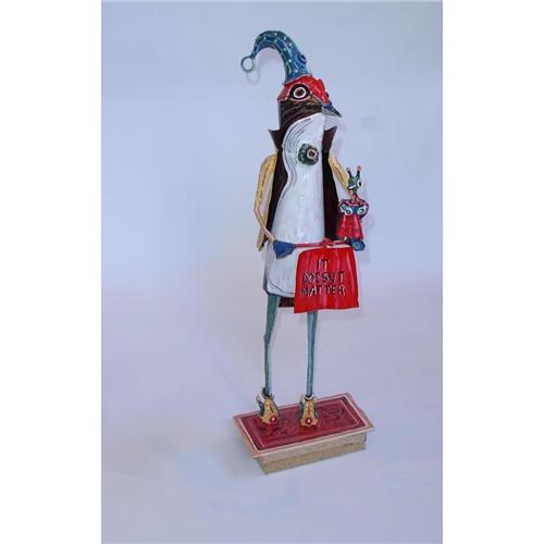 “It Doesn’t Matter”: A fantastic bird-like figure attired in a white apron and yellow coat, and carrying a red bag.