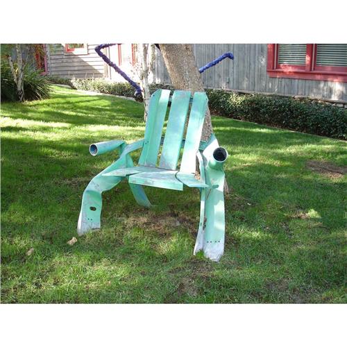 Welded and Verde-Patinated Metal Lawn Chair:- Detailed with three-plank back, three-plank seat, and massive tubular arms.