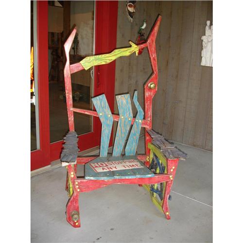 Whimsically Constructed and Painted Wood Armchair: - The plank seat appliquéd with a portion of a sign reading “No stopping anytime.”