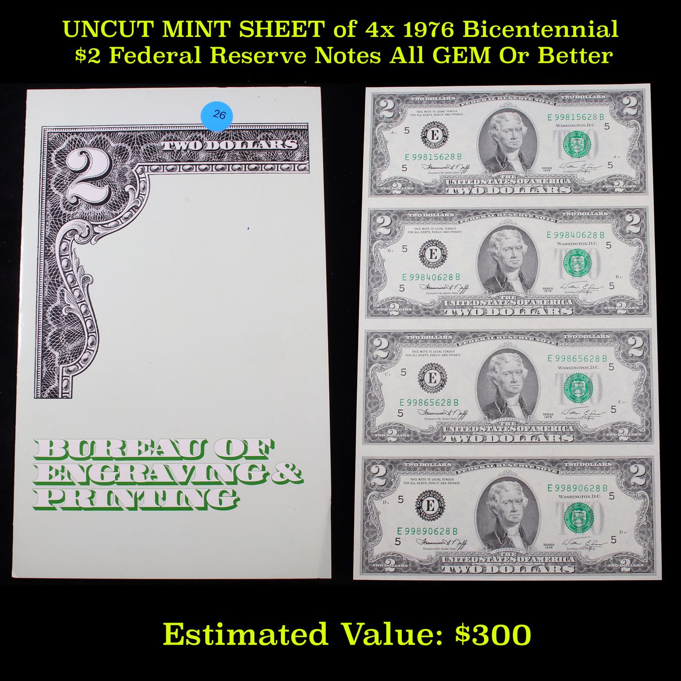UNCUT MINT SHEET of 4x 1976 Bicentennial $2 Federal Reserve Notes All GEM Or Better.