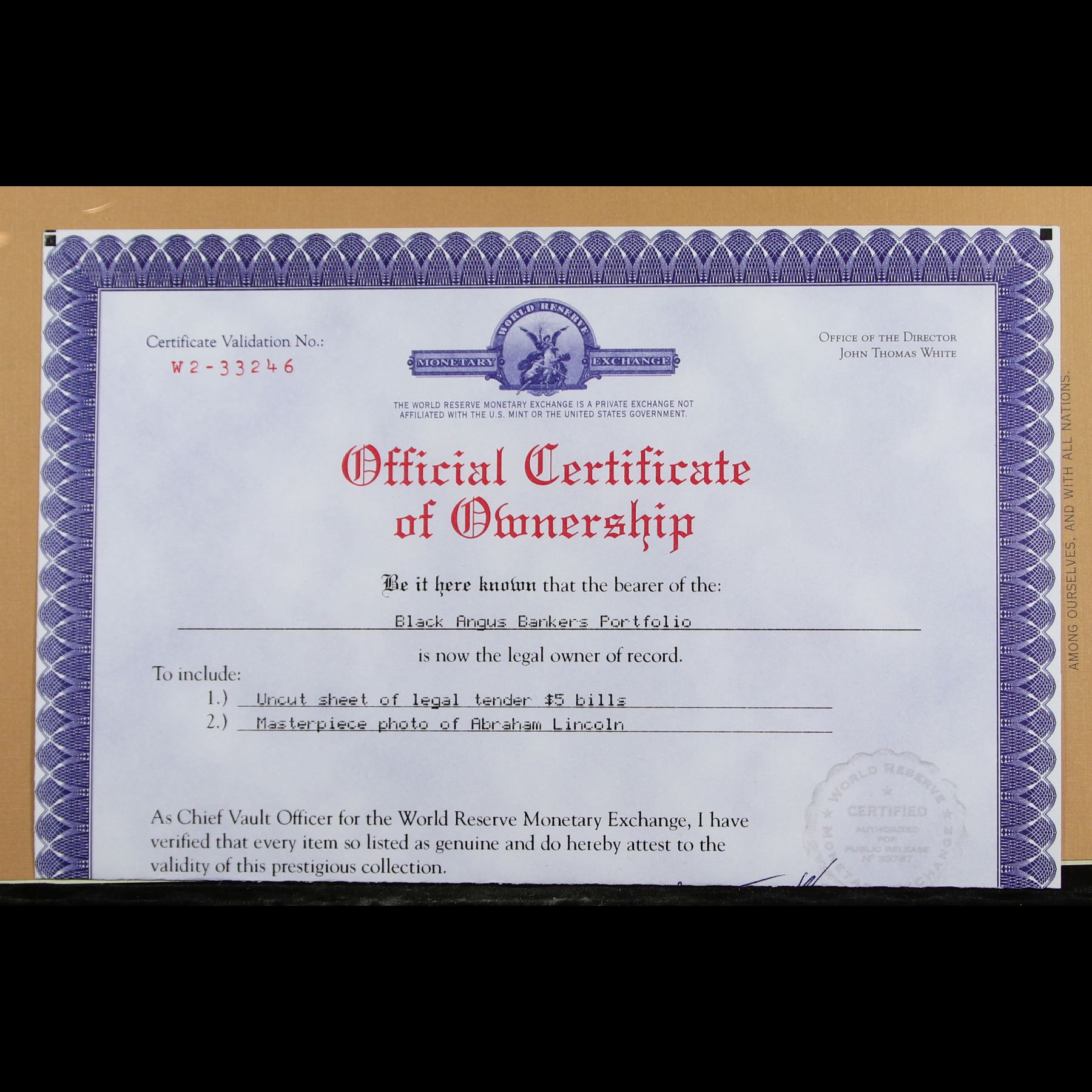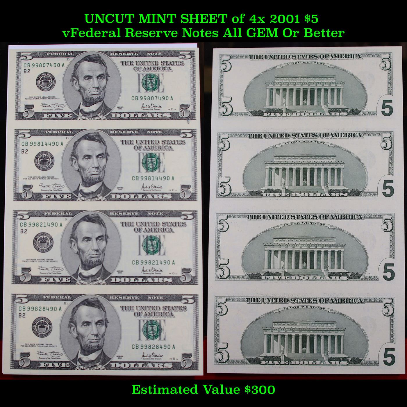 UNCUT MINT SHEET of 4x 2001 $5 Federal Reserve Notes All GEM Or Better. Comes With COA From The World Reserve Monitary Excange