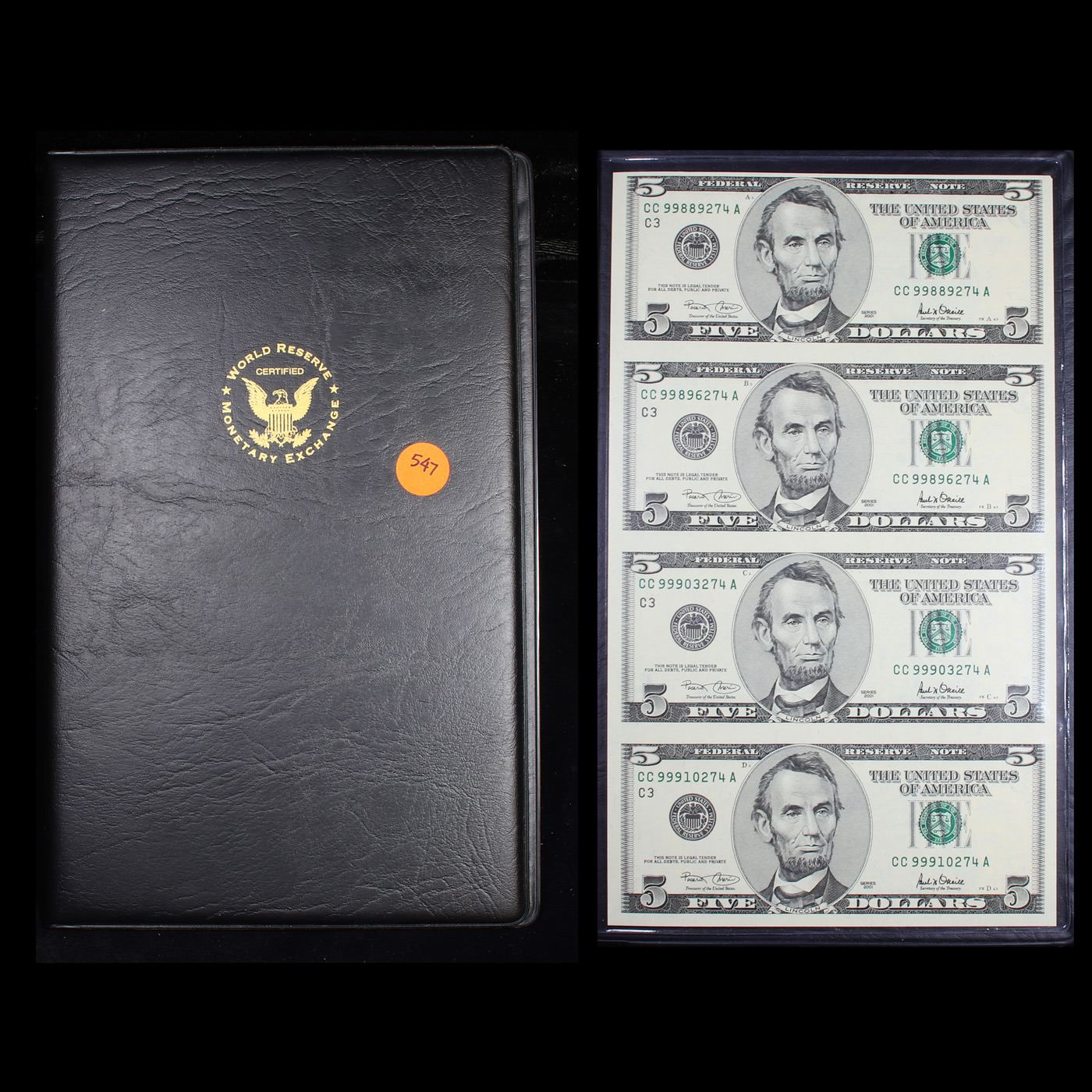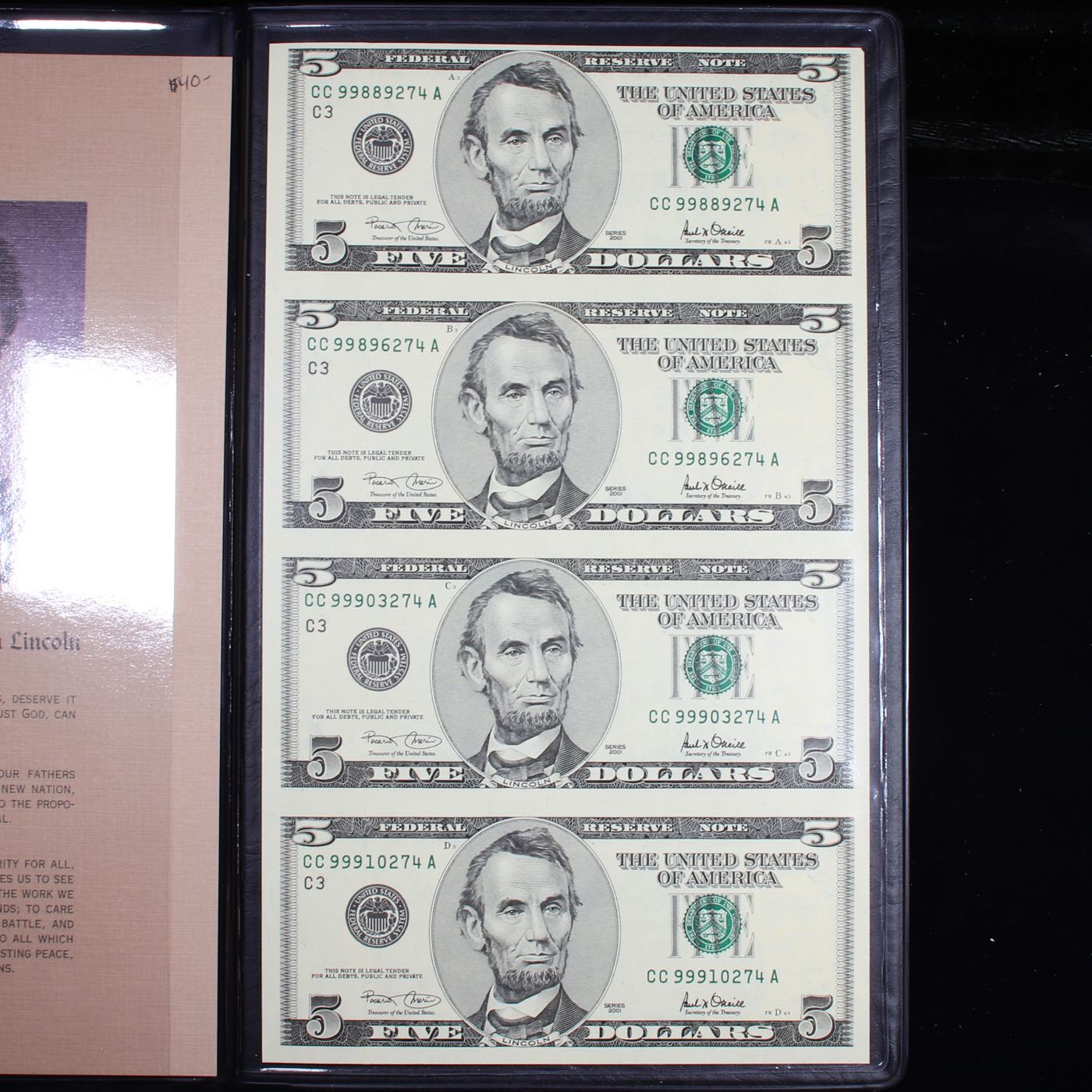 UNCUT MINT SHEET of 4x 2001 $5 Federal Reserve Notes All GEM or Better.