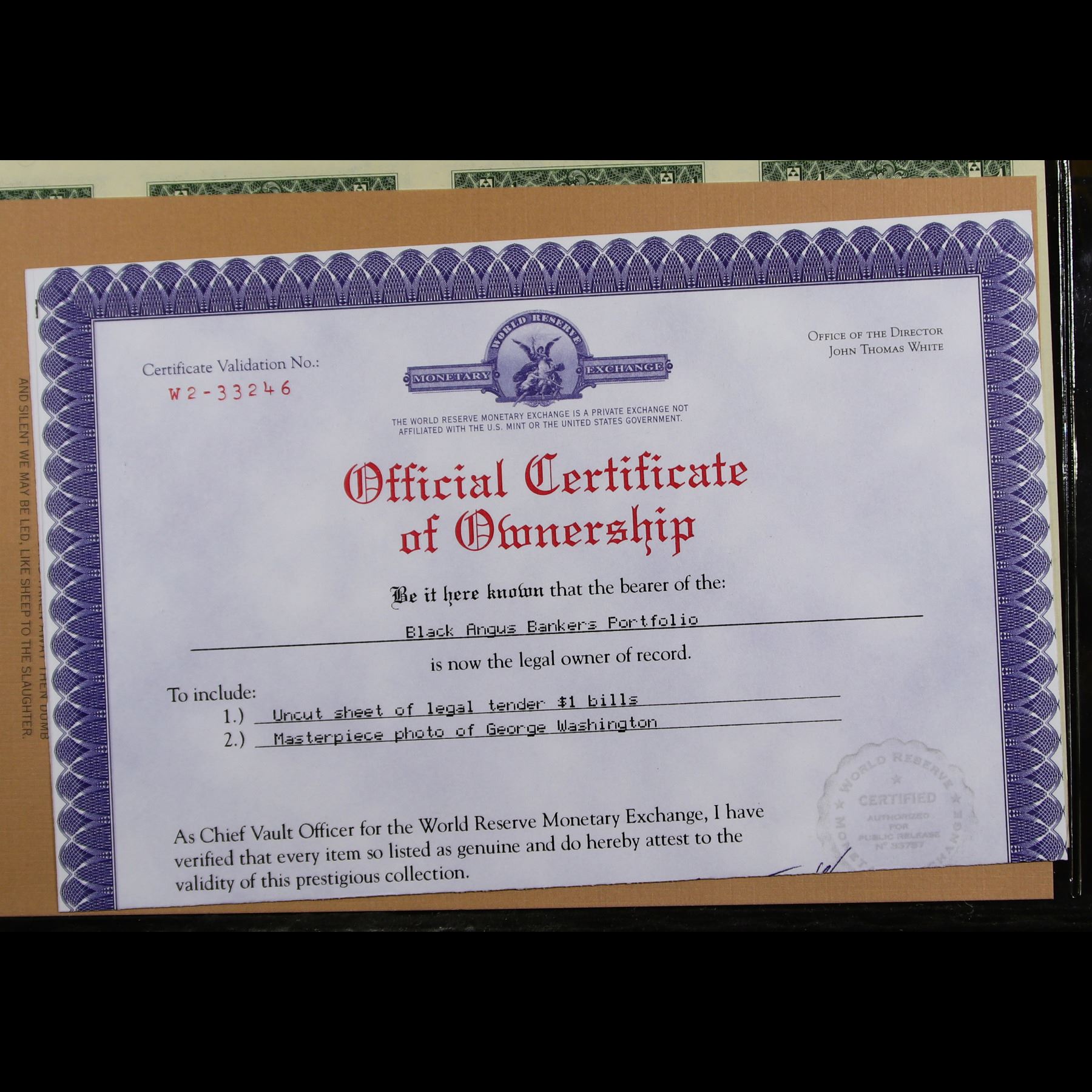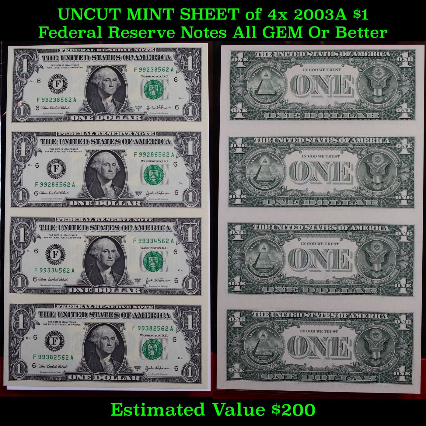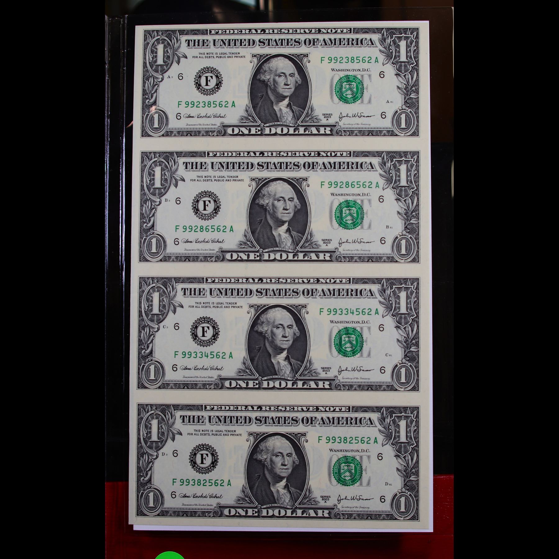 UNCUT MINT SHEET of 4x 2003A $1 Federal Reserve Notes All GEM Or Better. Comes With COA From The World Reserve Monitary Excange
