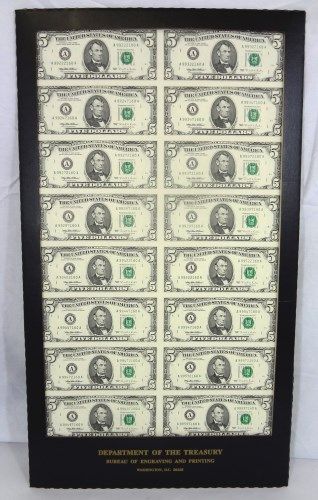 UNCUT SHEET OF 16 1995 $5.00 FEDERAL RESERVE NOTES, IN TREASURY BLACK HOLDER