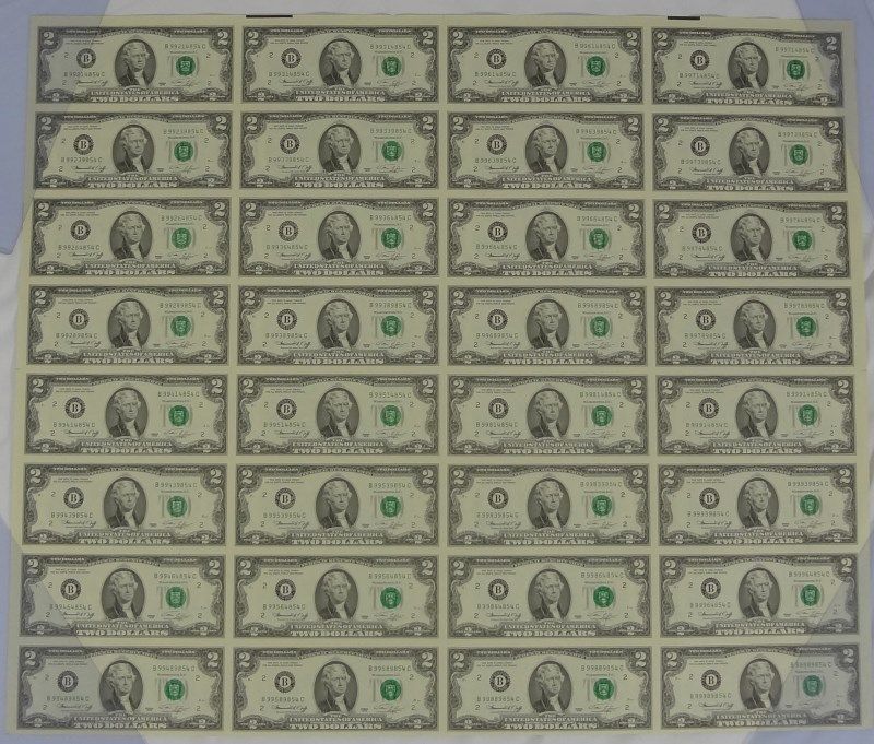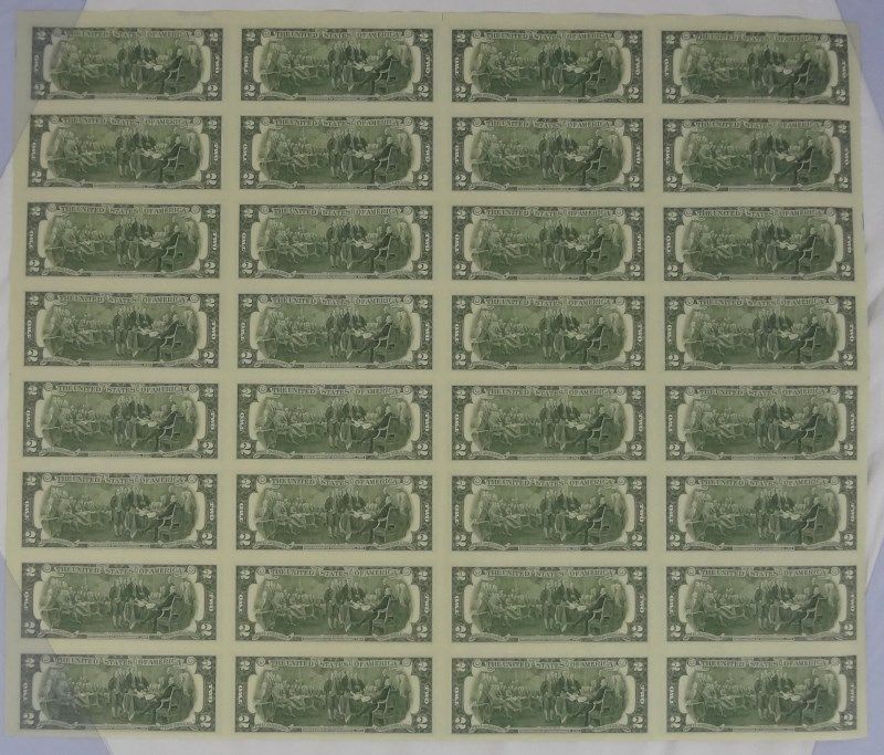 UNCUT SHEET OF (32) CHOICE UNCIRCULATED 1976 $2.00 US NOTES, BICENTENNIAL ISSUE