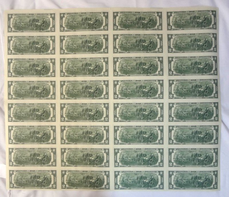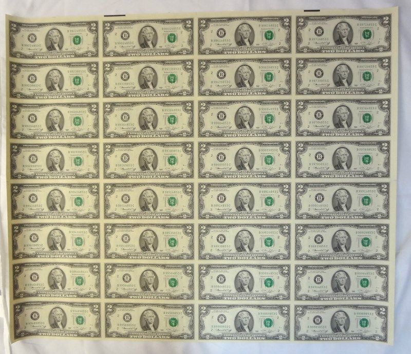 UNCUT SHEET OF (32) CHOICE UNCIRCULATED 1976 $2.00 US NOTES, BICENTENNIAL ISSUE