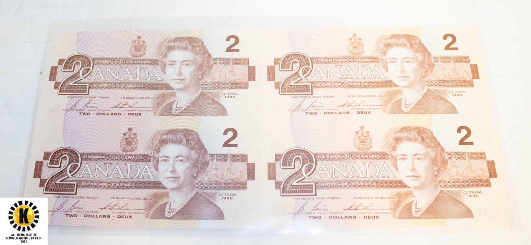 UNCUT SHEET OF 4 1986 2 DOLLAR BILLS CANADA