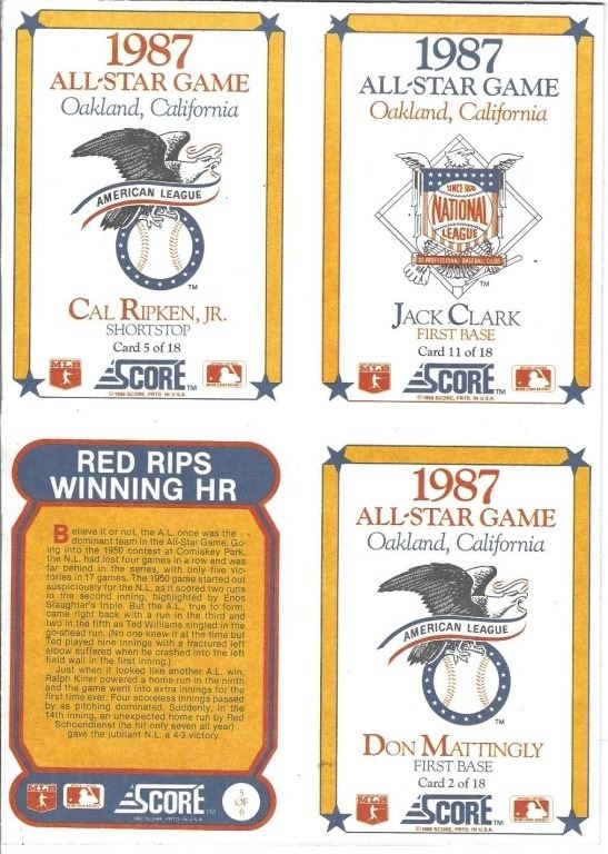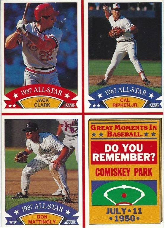 UNCUT SHEET OF 4 1988 SCORE BASEBALL CARDS JACK CLARK, CAL RIPKEN JR. DON MATTINGLY & COMISKEY PARK