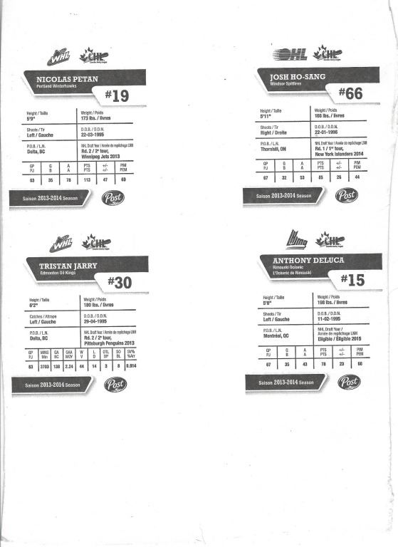 UNCUT SHEET OF 4 2013--2014 POST HOCKEY CARDS JOSH HO-SANG, NICOLAS PETAN, ANTHONY DELUCA & TRISTAN JERRY (830)
