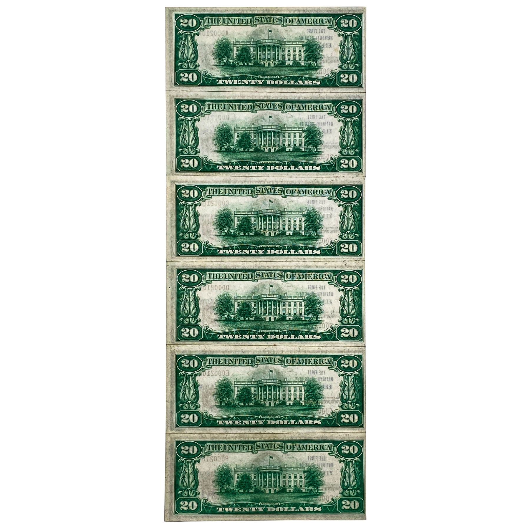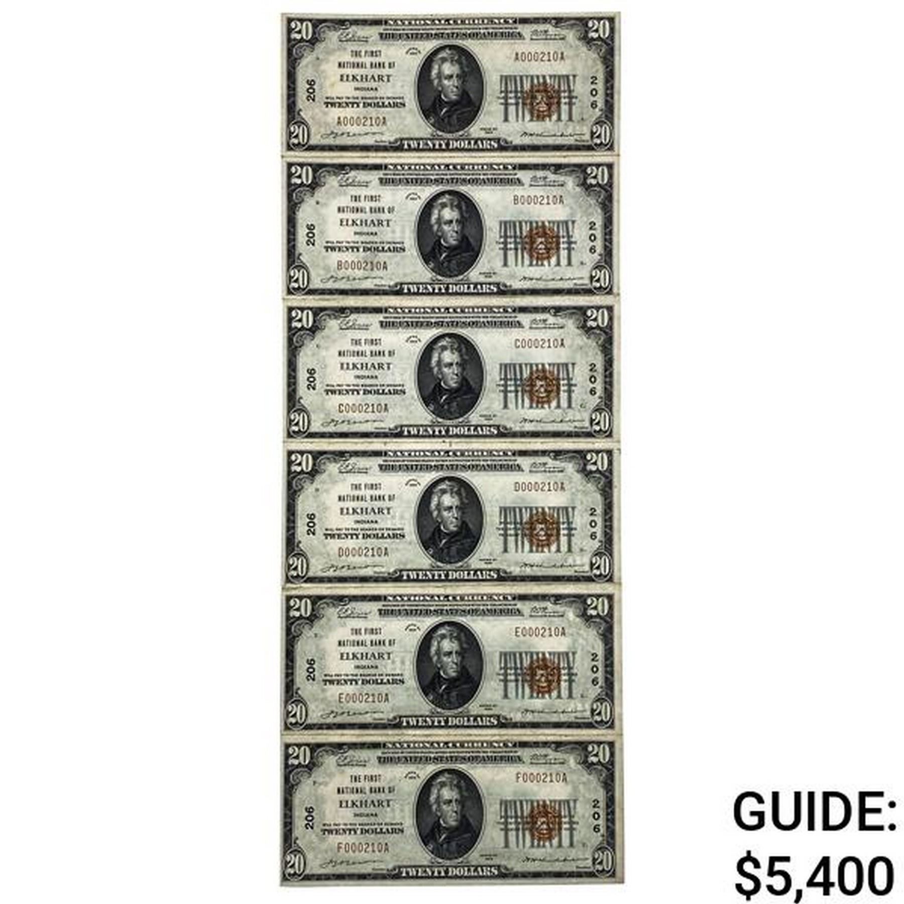 UNCUT SHEET OF (6) 1929 $20 ELKHART, IN CH. #206