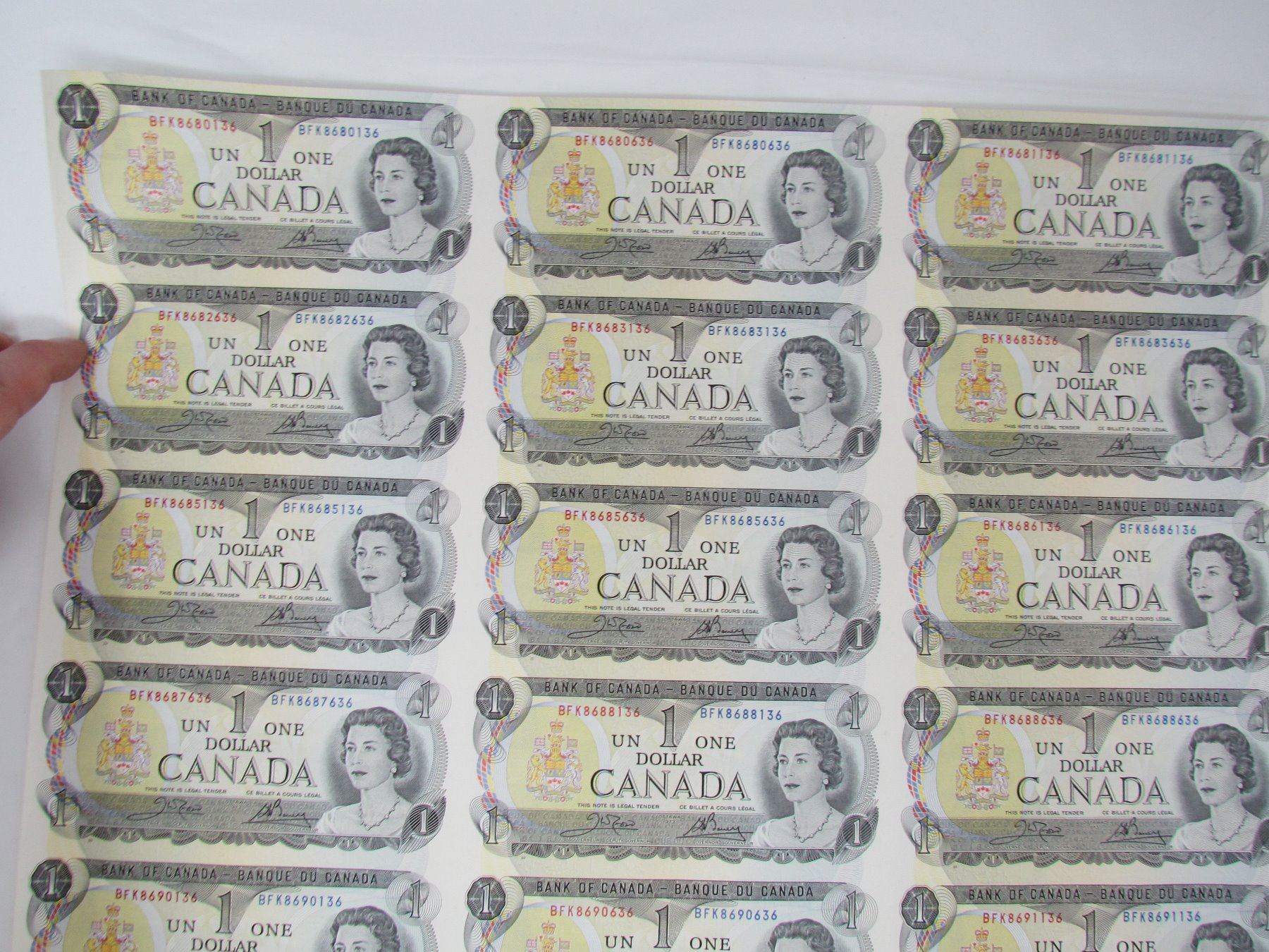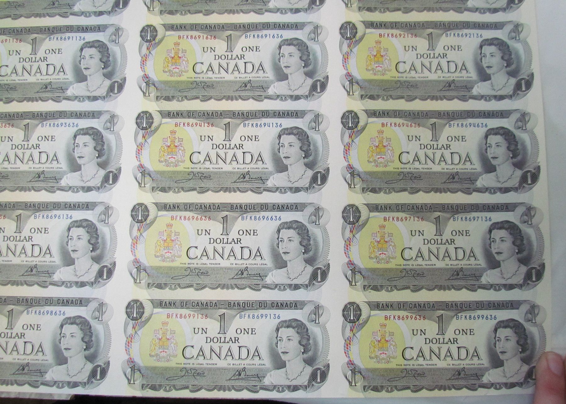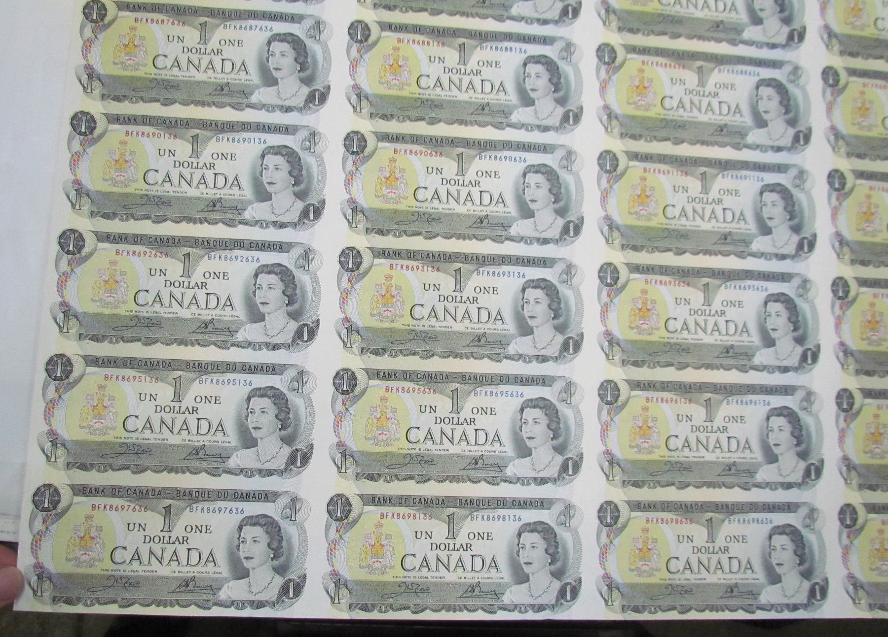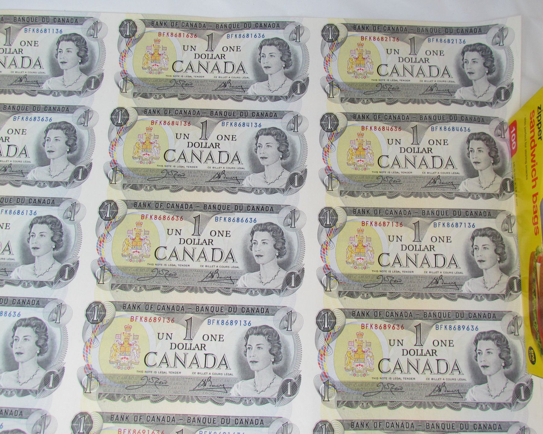 UNCUT SHEET OF ONE DOLLAR BILLS (CANADA) *1973* (8 ROWS OF 5 BILLS)