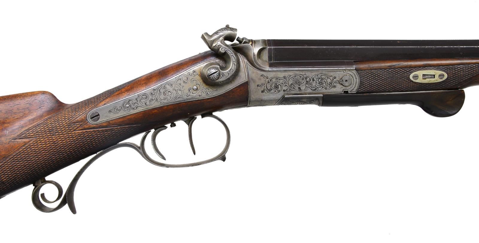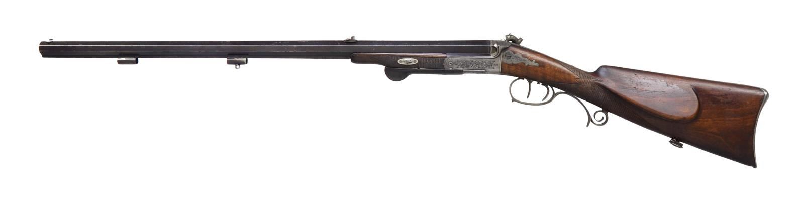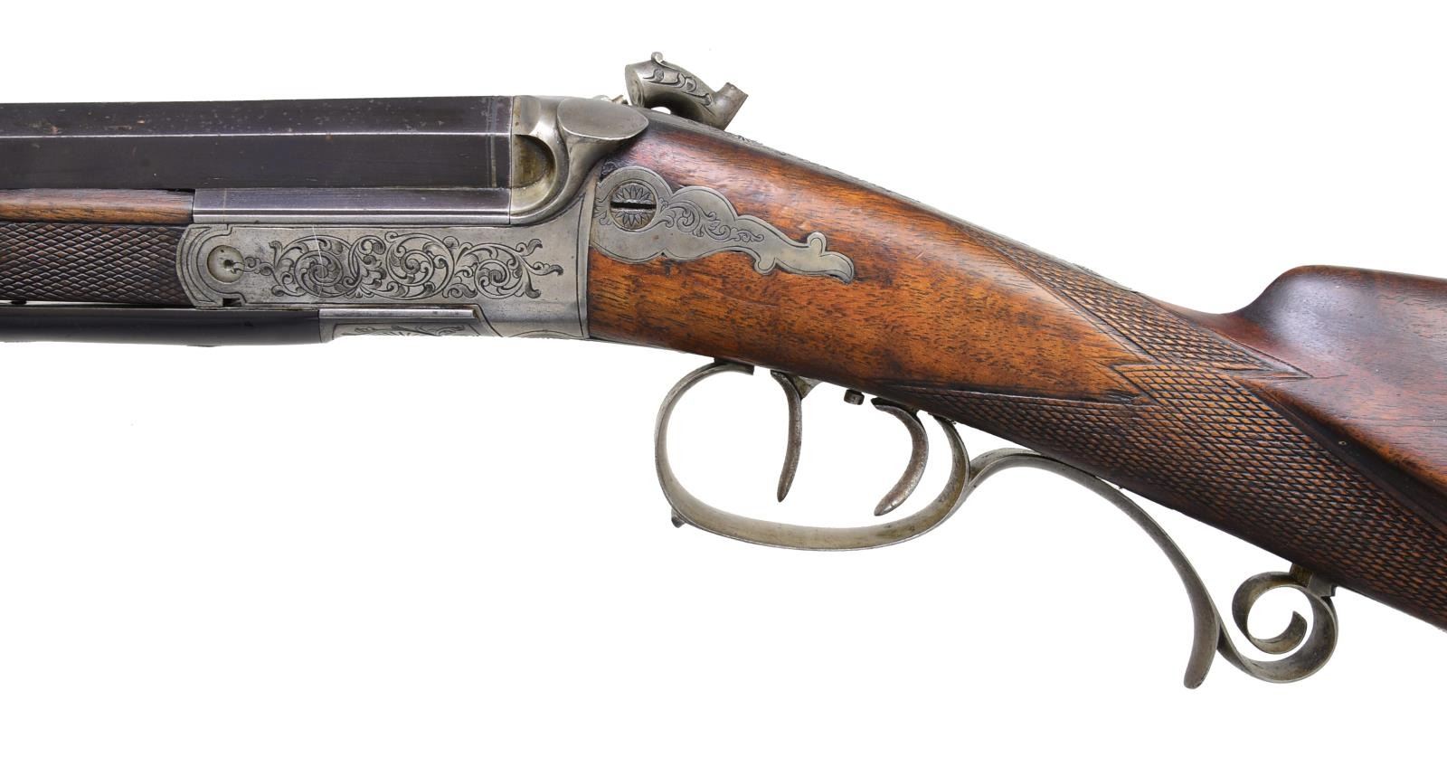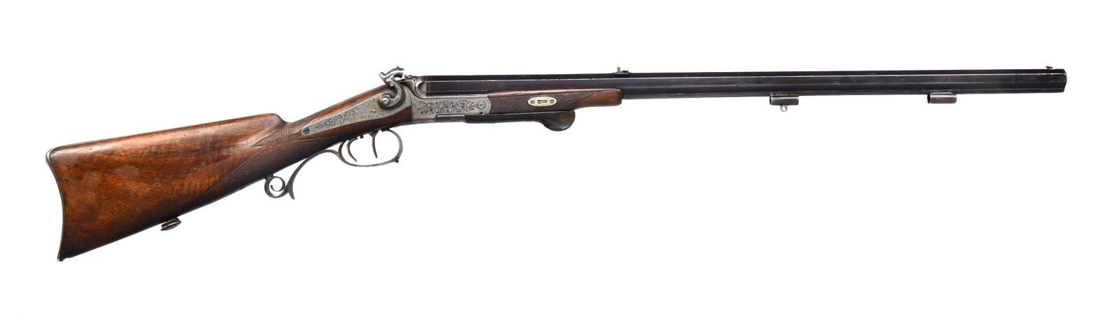 BY CHRISTOPH FUNK. Cal. 16 bore. NSN. 26 1/2" Octagonal bbl. is silver inlaid w/ maker's name & "SUHL" on unmatted portion of top flat. Bbl. is mounted w/ 1 standing 1 folding leaf rear sight & silver bead front dovetailed through. Bbl. is fitted w/ underrib for cleaning rod held by 2 plain pipes, rear w/ sling eye. Rnd. bodied front pivoting underlever action is fitted w/ peninsula right hand back spring non rebounding lock w/ short serpentine hammer. Operating lever is covered in horn. Action & lock are engraved w/ 80% coverage lg. open scroll. Steel trigger guard w/ scroll on bow has scrolled extension forming pistol grip. Triggers are dbl. set. Lightly figured European walnut buttstock measures 13 1/4" over steel buttplate & features right hand cheekpiece & widely spaced point pattern checkering. Captive forend attaches to lift out bbl. w/ sliding bolt through oval German silver escutcheons. CONDITION: very good to fine, mostly original. Bbl. retaining most of what appears to be its original blue w/ scattered spots of rust, silvering on sharp edges. Action & lock retain traces of their original case hardening color, perhaps as much as 20%. Stock w/ 30-40% of what appears to be original finish w/ considerable wear & many marks. Bore is very good to fine, shiny w/ some scattered pitting at breech end. Action is tight. Top spur of hammer is broken off, cleaning rod missing. Triggers set. (01-18691/MGM69). ANTIQUE (no proofs, pre 1891). $800-1,500.