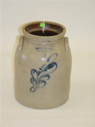 UNDERWOOD 3 GAL. STORAGE JAR W/ COBALT FLUME MARKED J.A. & C.W. UNDERWOOD FORT EDWARDS NY - BURN IN DECORATION, 3" HAIRLINE ON TOP RIM;