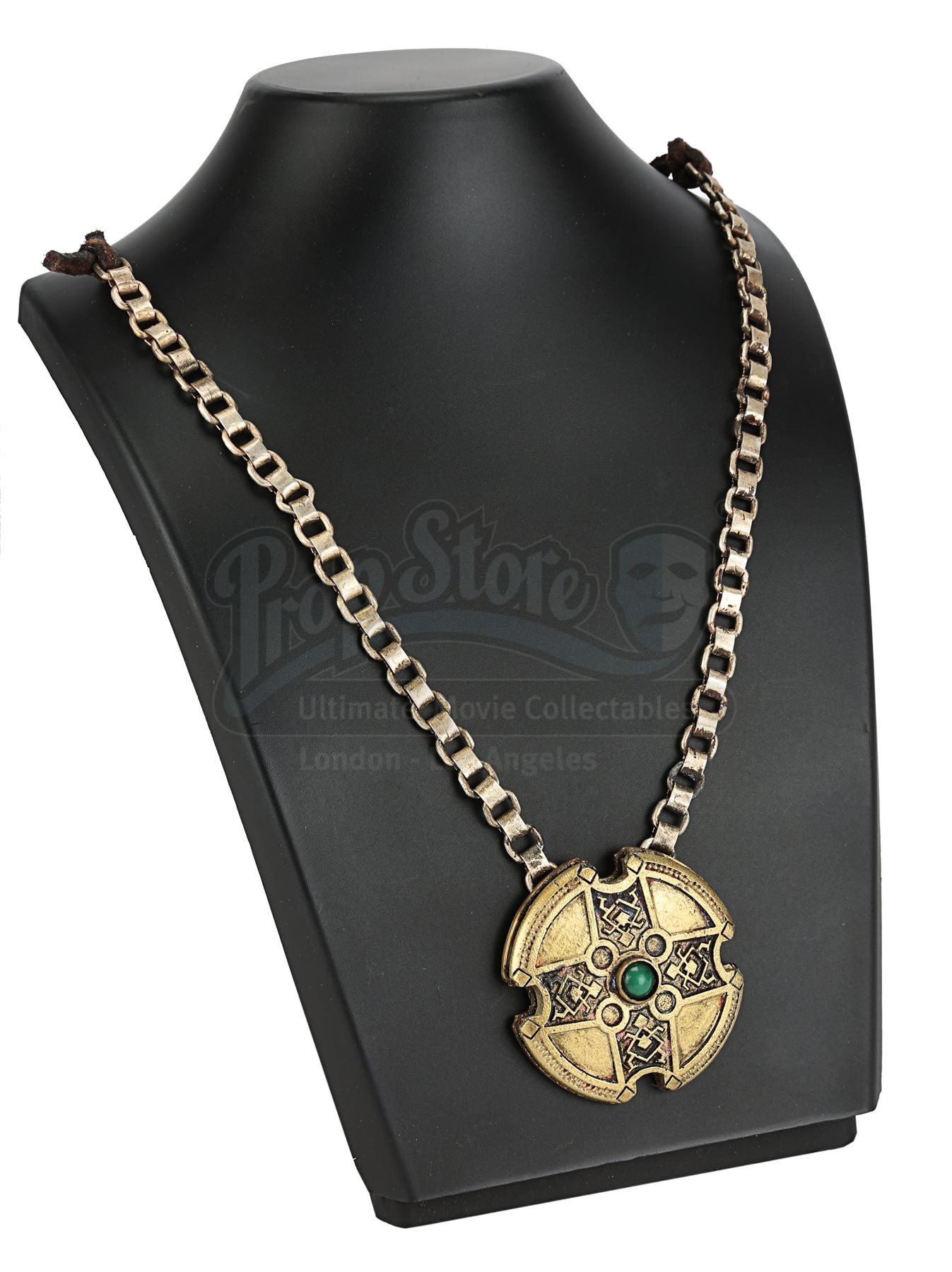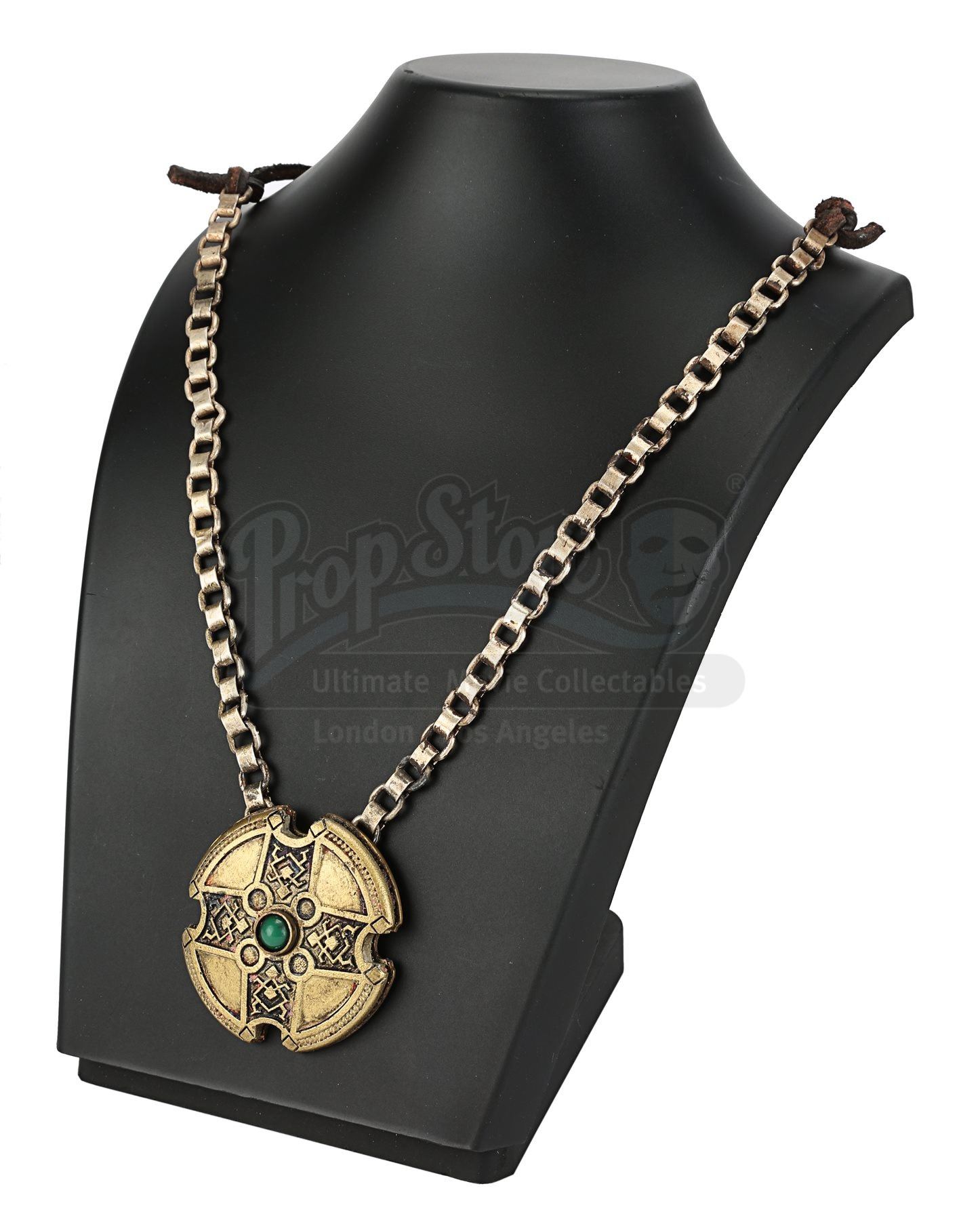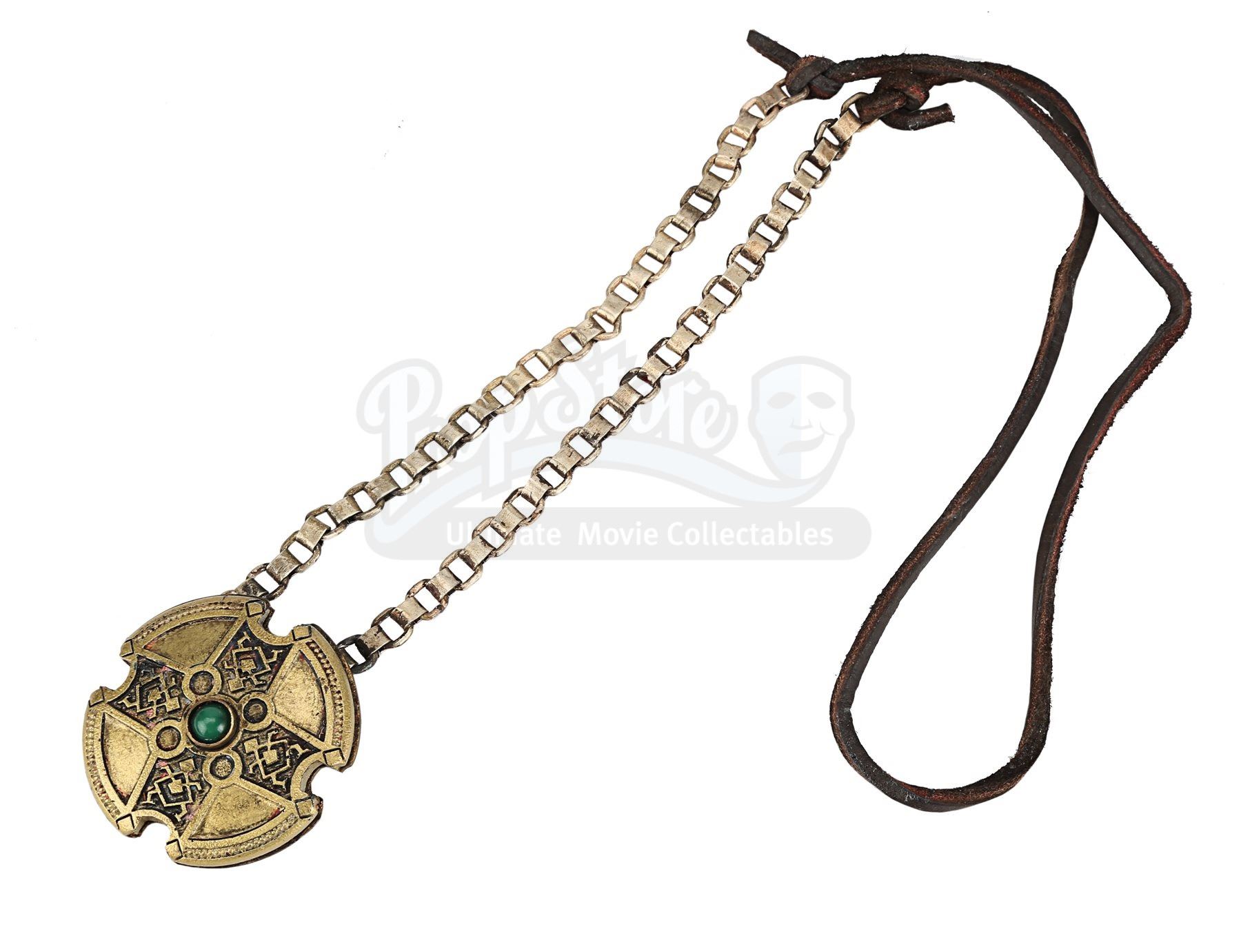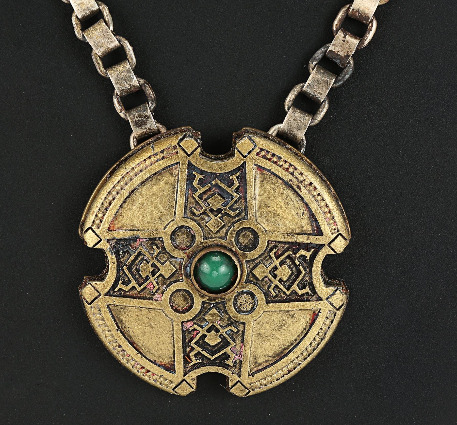 Constructed from cast metal, the pendant has a distressed faux-gold paint finish and features a decorative cross pattern with a plastic green stone at the centre. It hangs on a metal-link chain secured to a length of brown leather. The necklace shows evidence of wear from its time spent on the production, including a slight pink paint residue left in the recesses and a length of tape secured to the reverse of the pendant. Dimensions (laid out): 43 cm x 6 cm x 1.5 cm (17” x 2 ½” x ½”)