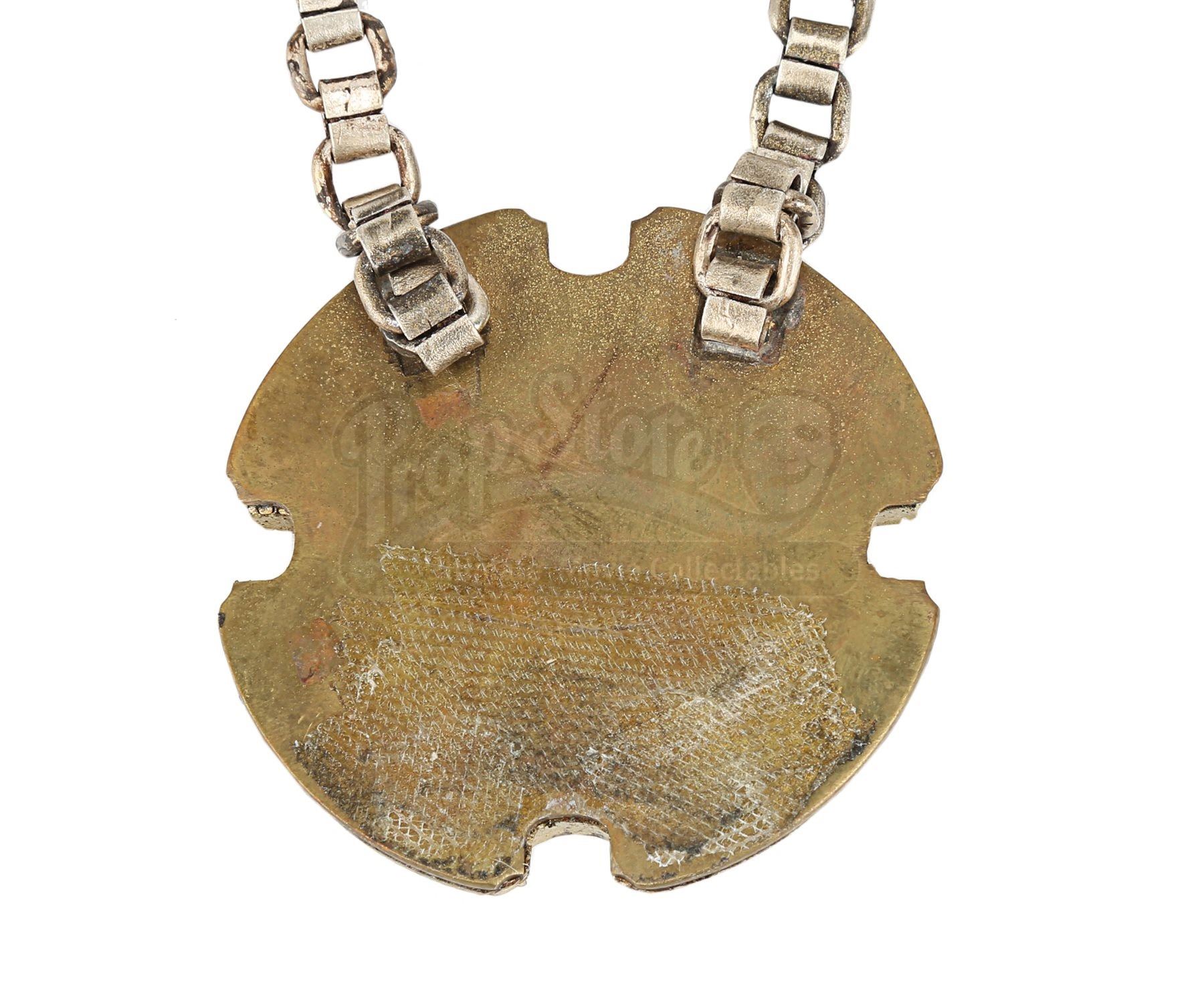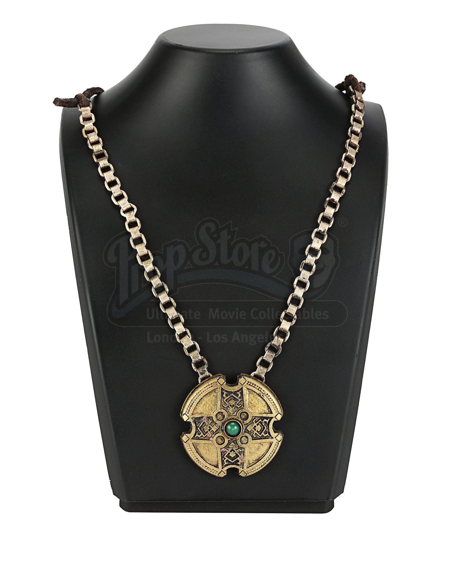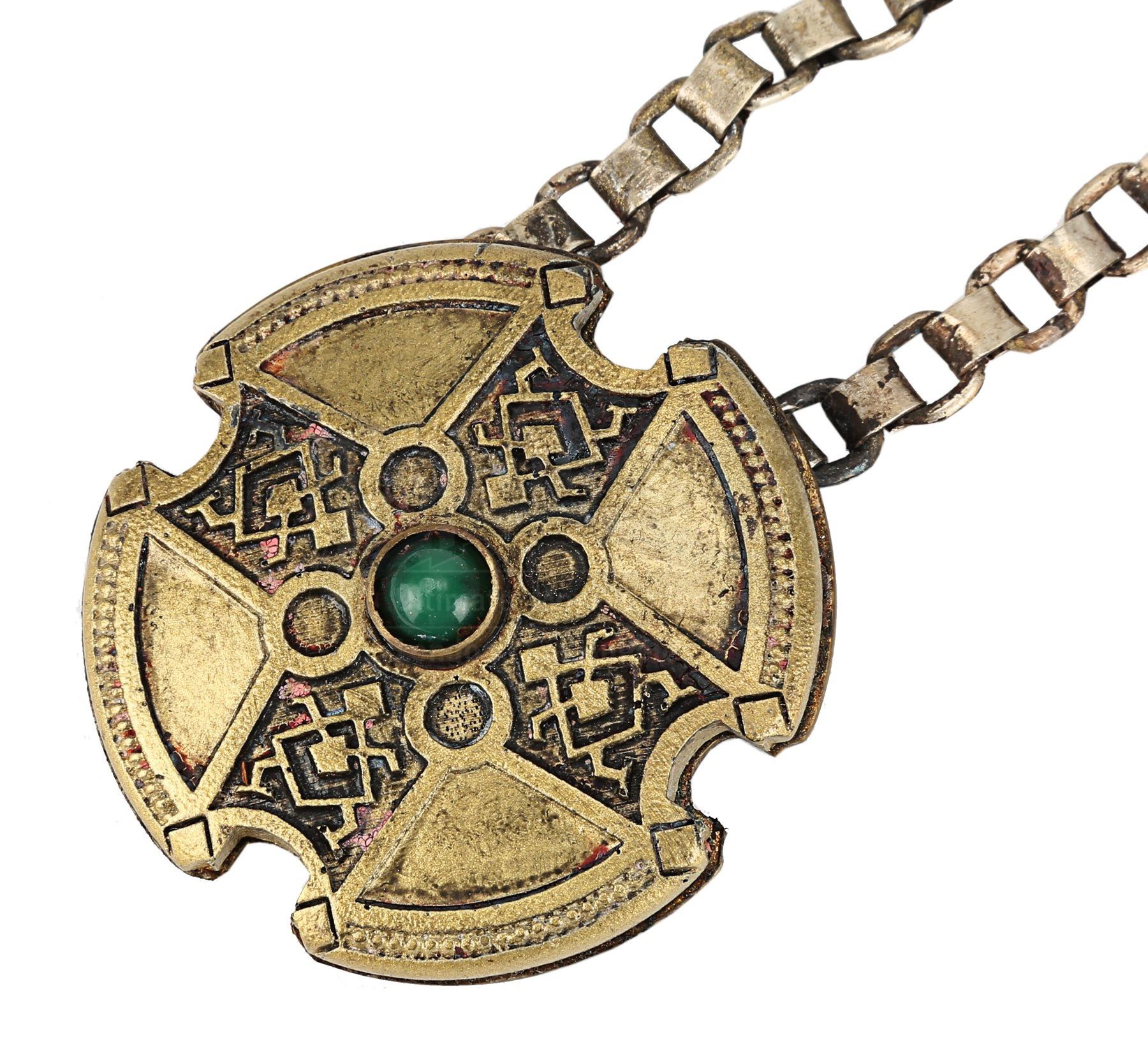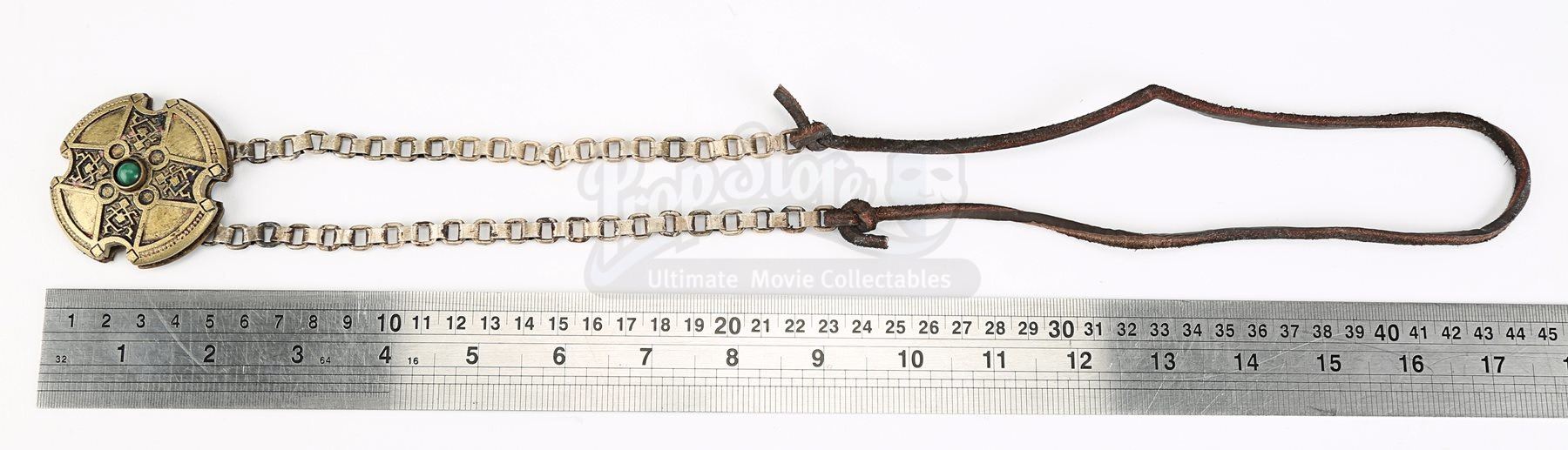 Constructed from cast metal, the pendant has a distressed faux-gold paint finish and features a decorative cross pattern with a plastic green stone at the centre. It hangs on a metal-link chain secured to a length of brown leather. The necklace shows evidence of wear from its time spent on the production, including a slight pink paint residue left in the recesses and a length of tape secured to the reverse of the pendant. Dimensions (laid out): 43 cm x 6 cm x 1.5 cm (17” x 2 ½” x ½”)