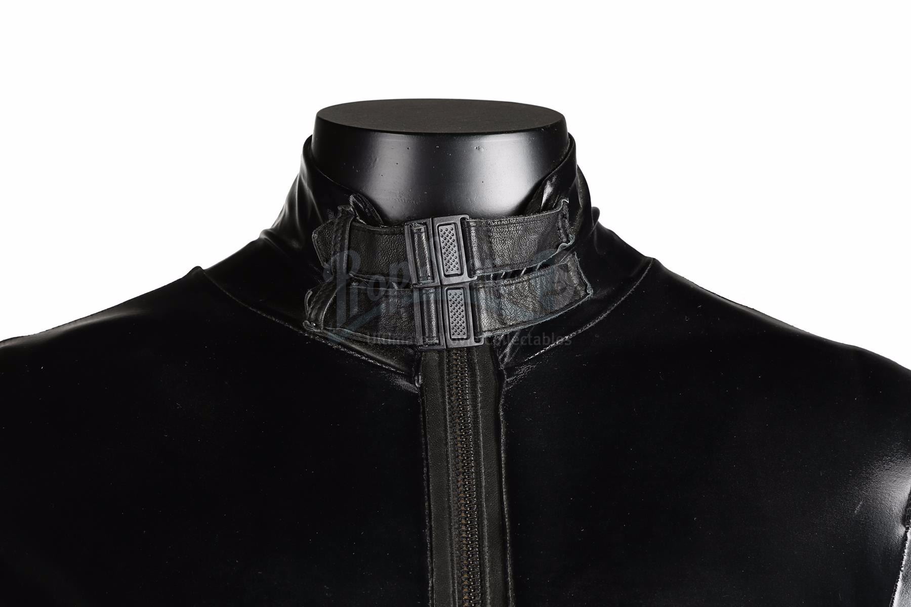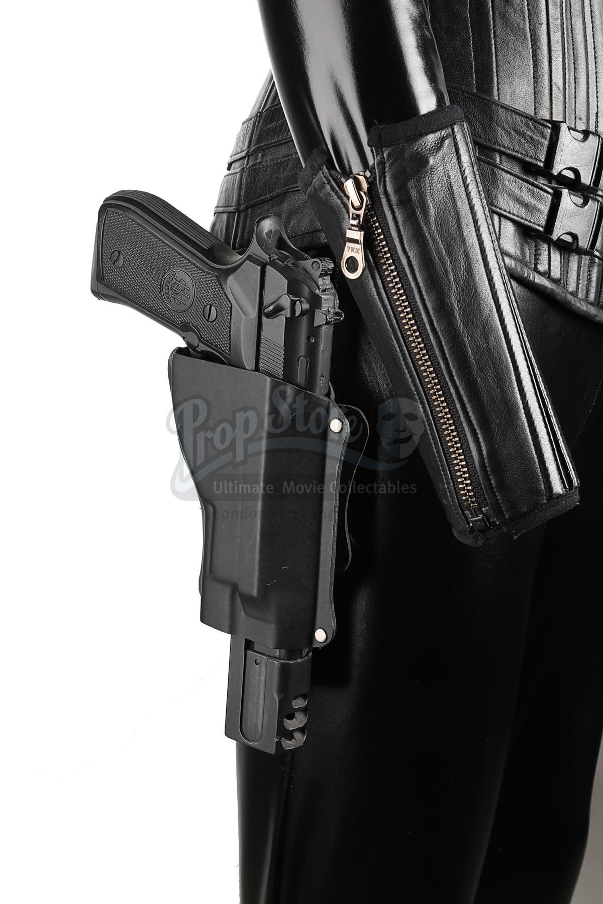 A rubber stunt pistol, cast from one of the hero custom Beretta sidearms, is secured in a magnetised holster at the hip. The magnets were incorporated to allow the weapon to adhere to the costume without the need for bulky clips or attachments. The outfit is displayed on a custom-made mannequin form and remains in excellent condition. Dimensions (displayed): 36 cm x 50 cm x 178 cm (14'' x 19 1/2'' x 70'')