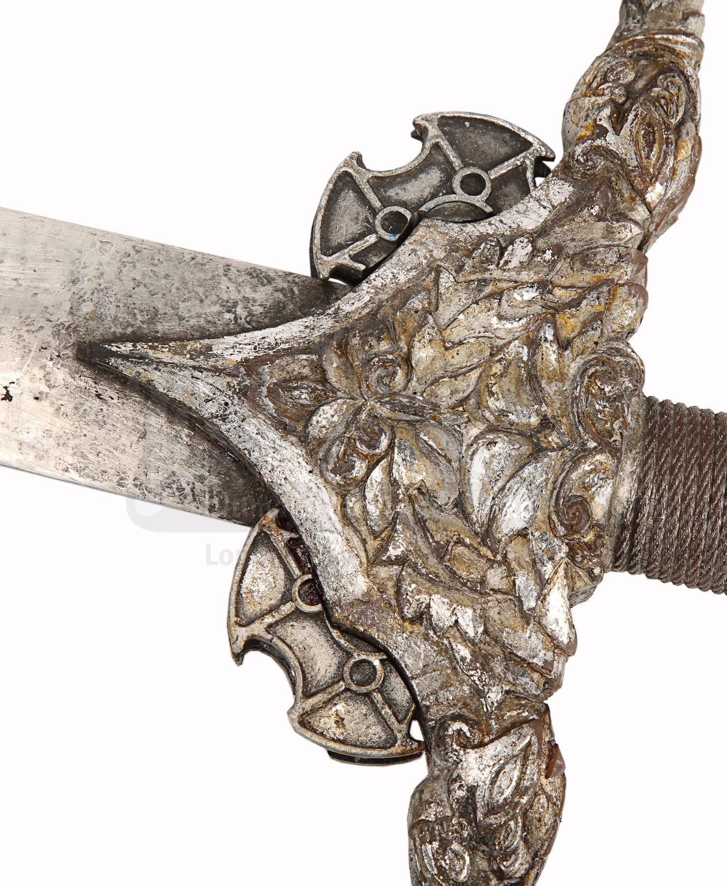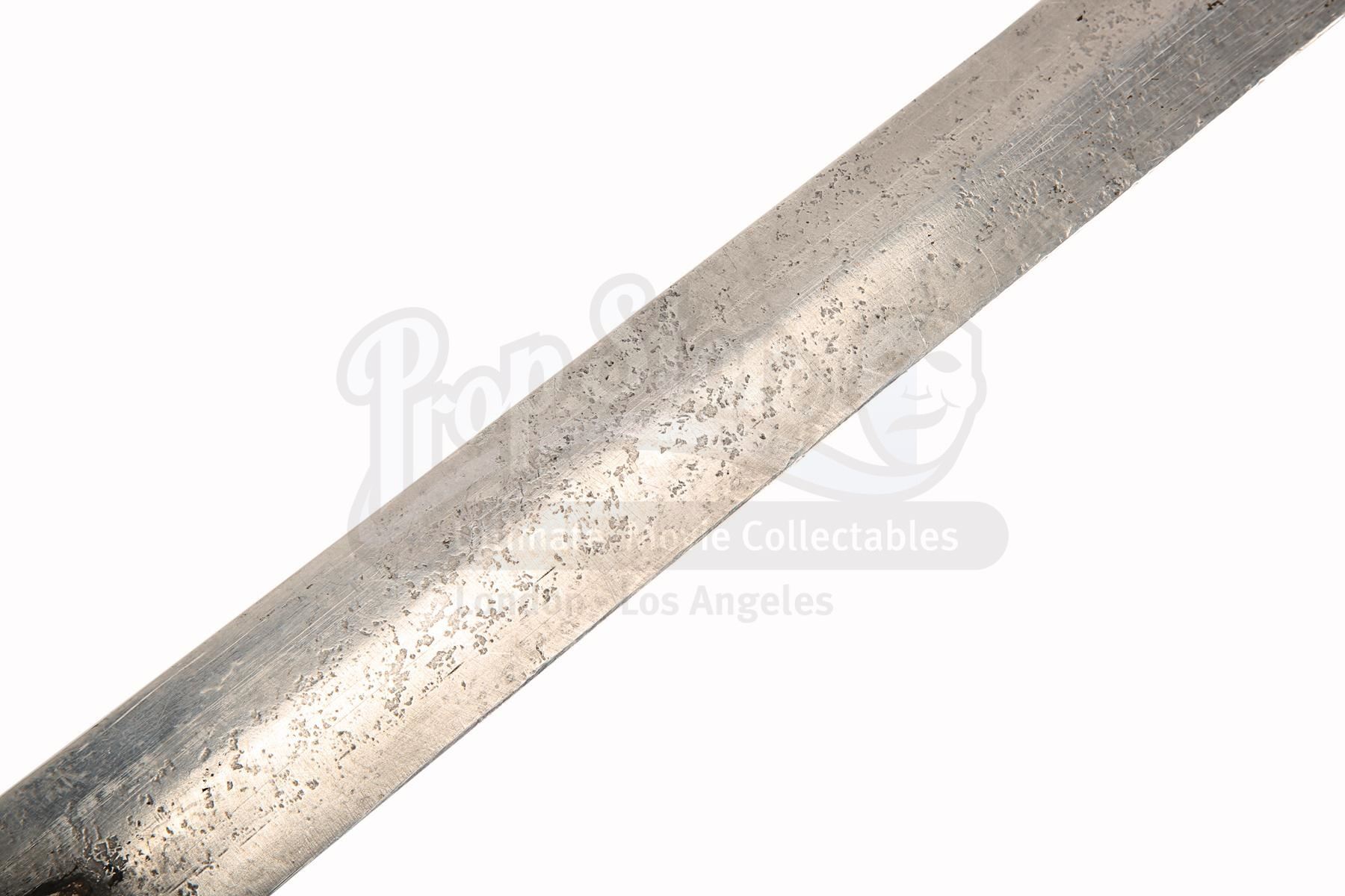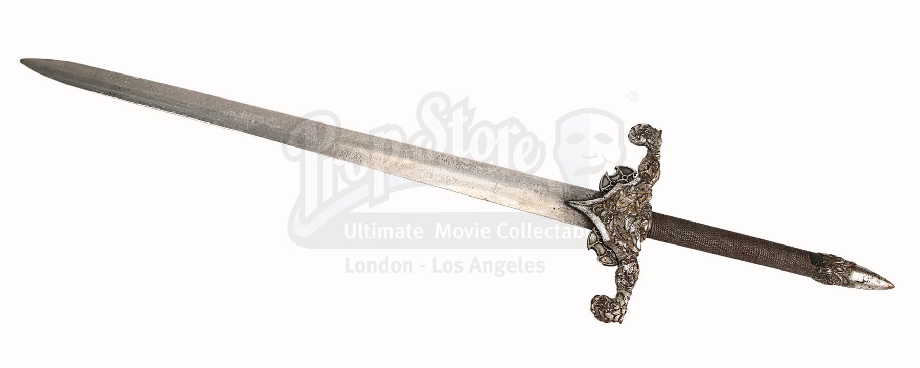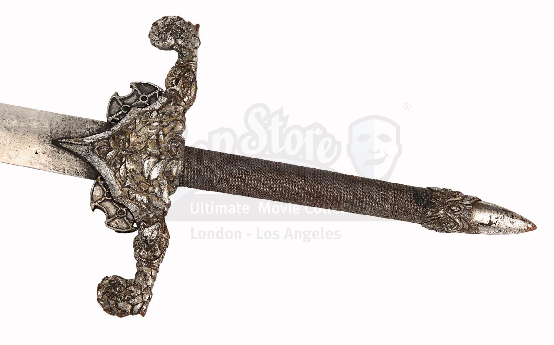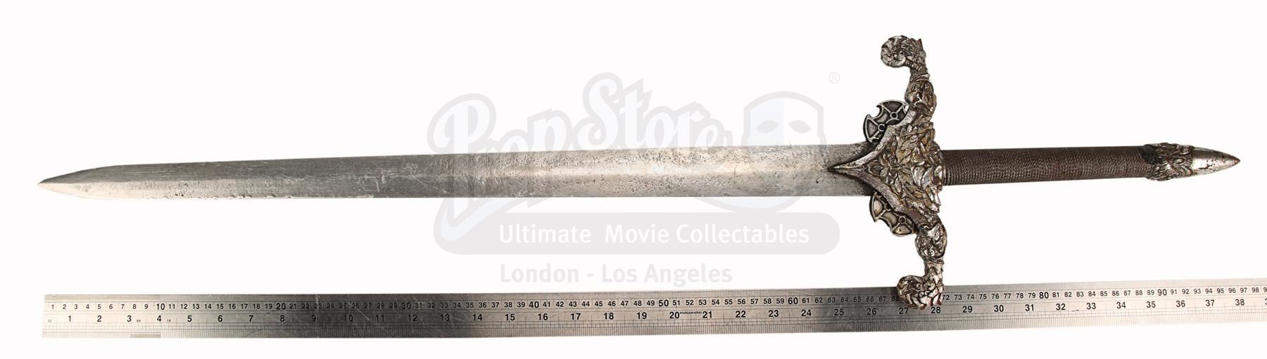 The sword features a metal blade and resin guard, handle and pommel. The handle is wrapped in rubber made to resemble string. Various detailing has been painted faux silver to appear as though it's made of metal, while the sword has been intentionally distressed to appear well-used. The paint on the guard has worn away in places and there are scuffs and dents along the blade, where it has come into contact with other swords during the film's fight sequences. Dimensions: 97 cm x 22 cm x 3 cm (38 1/4" x 8 3/4" x 1 1/4")
