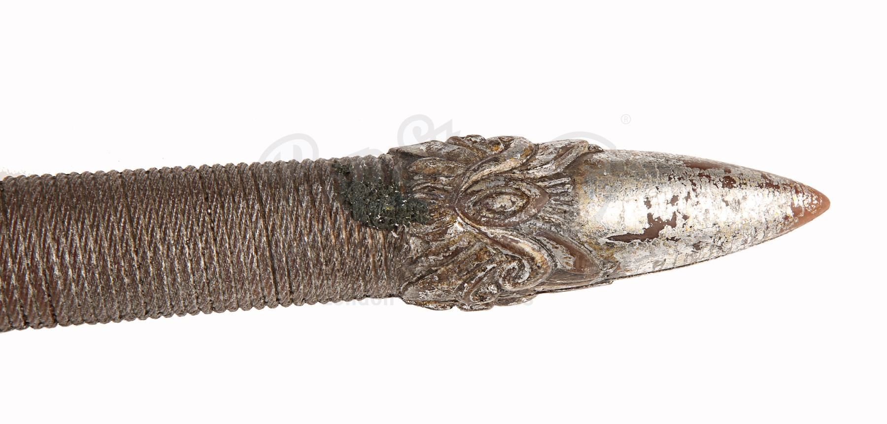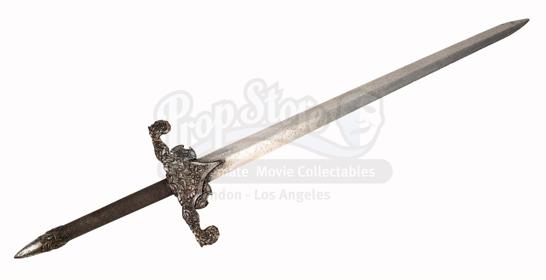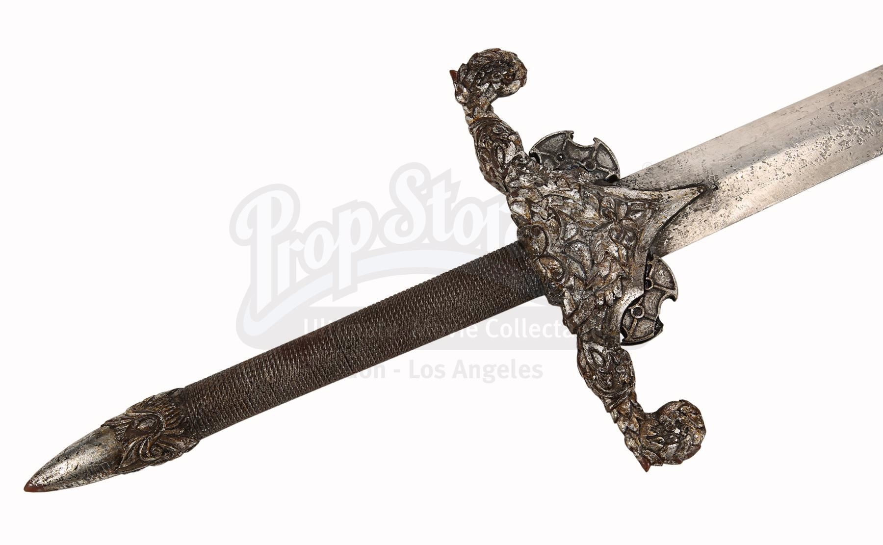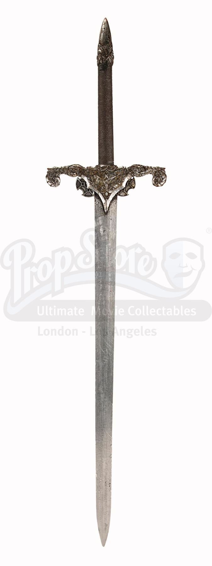 The sword features a metal blade and resin guard, handle and pommel. The handle is wrapped in rubber made to resemble string. Various detailing has been painted faux silver to appear as though it's made of metal, while the sword has been intentionally distressed to appear well-used. The paint on the guard has worn away in places and there are scuffs and dents along the blade, where it has come into contact with other swords during the film's fight sequences. Dimensions: 97 cm x 22 cm x 3 cm (38 1/4" x 8 3/4" x 1 1/4")
