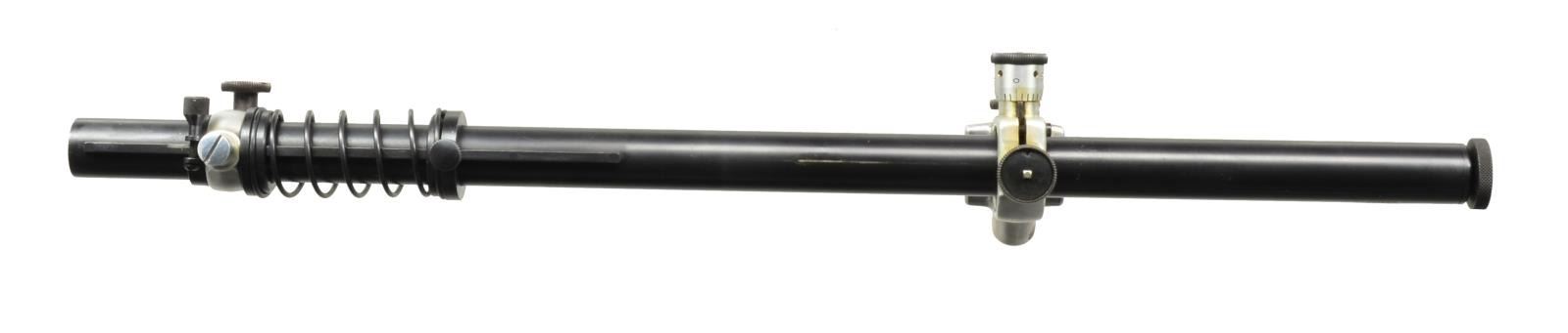 Used in place of receiver sight allowing use of existing scope blocks in conjunction w/ a front sight. Has appearance of sm. target scope missing objective & eyepiece. Rear has target disk. Adjustments are made w/ standard natural aluminum target mts. to include recoil spring & stops at front. CONDITION: very good to near excellent w/ 3 sm. linear rub marks on tube corresponding to pressure points of rear mt. (02-13918/NW). $100-200.