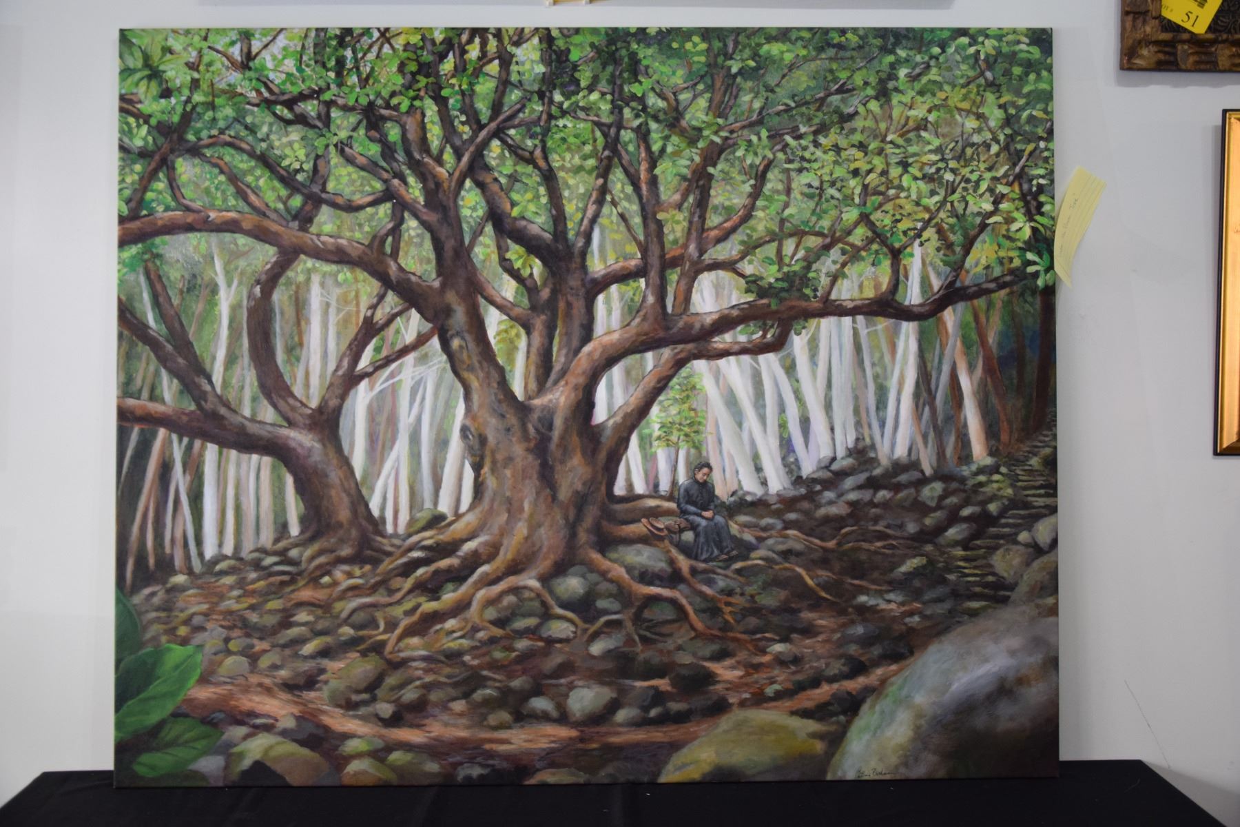 UNFRAMED OIL ON CANVAS, "UNDER THE PRAYER TREE"; SIGNED CATHERINE BUCHANAN, (48" X 59 3/4") (FROM REV. CLARENCE GUERREIRO COLLECTION)