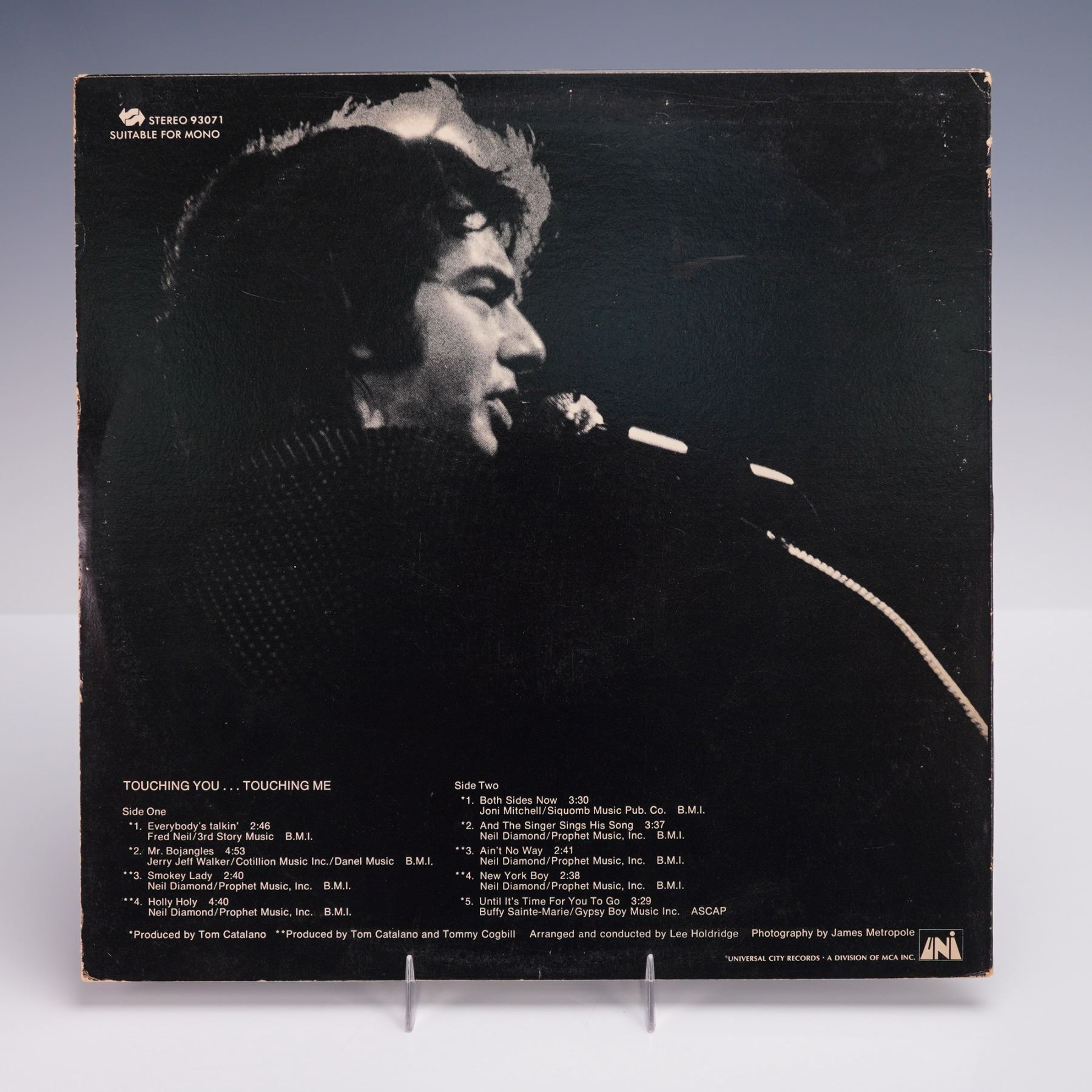 A 12-inch vinyl record album titled "Touching You, Touching Me" by Neil Diamond, released by UNI Records. The album features a collection of ten tracks, including "Holly Holy," "Mr. Bojangles," "Everybody's Talkin'," and "Until It's Time for You to Go," with production credits to Tom Catalano and Tommy Cogbill and arrangements conducted by Lee Holdridge. The front and reverse of the album jacket are adorned with monochromatic photographic portraits of the artist captured by James Metropole, The record bears the signature vibrant UNI label in yellow.