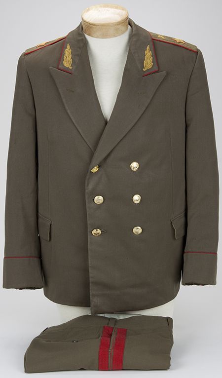 KONSTANTIN PETROVICH KAZAKOV (1902-1989) Marshal of the Soviet Union (Artillery). Kazakov was a worker before he joined the Soviet Army in 1921. He began as a commander of a howitzer artillery regiment; in June 1941 he became chief of operations of the artillery department of the Southwestern Front, and in April 1942 he moved to the staff of the chief of the artillery of the Red Army. From April 1944 to May 1945 he commanded the artillery of the Second Shock Army, participating in the liberation of the Baltic area and in battles in East Prussia. Awarded three Orders of Lenin, the Order of the October Revolution, four Orders of the Red Banner, two Orders of Suvorov Second Class, Orders of Kutuzov First and Second Class. Fine grouping of material including his post-war dress tunic and pants, the tunic adorned with bullion shoulder boards and collar tabs with red piping, the pants likewise bearing three red vertical stripes, both articles in very good condition. Also present is a small archive of 24 May Day and other greeting cards sent to Kazakov bearing patriotic and friendly messages signed by top-level politicians and fellow generals. These include: LEONID BREZHNEV (possible stamp), GENERAL SECRETARY ANDREI KIRILENKO, MINISTER OF DEFENSE ANDREI GRECHKO (2), MINISTER OF DEFENSE VIKTOR GRISHIN (3), MINISTER OF DEFENSE DMITRI USTINOV (3), MARSHAL YEVGENY SAVITSKY, MARSHAL SERGEI SOKOLOV (2), MARSHAL NIKOLAI OGARKOV, LT. GEN. STEPAN KALININ, MARSHAL VIKTOR KULIKOV, CHIEF OF STAFF MIKHAIL MOISEYEV, GEN. SERGEI SCHTEMENKO, GEN. VALENTIN VARENNEKOV (3), and others. Also present is a small presentation photograph album from a four-year military academy, Kiev, 1966, apparently attended by, and picturing his son or a relative with the same surname. A fine grouping of a uniform and rare Soviet World War II military autographs.