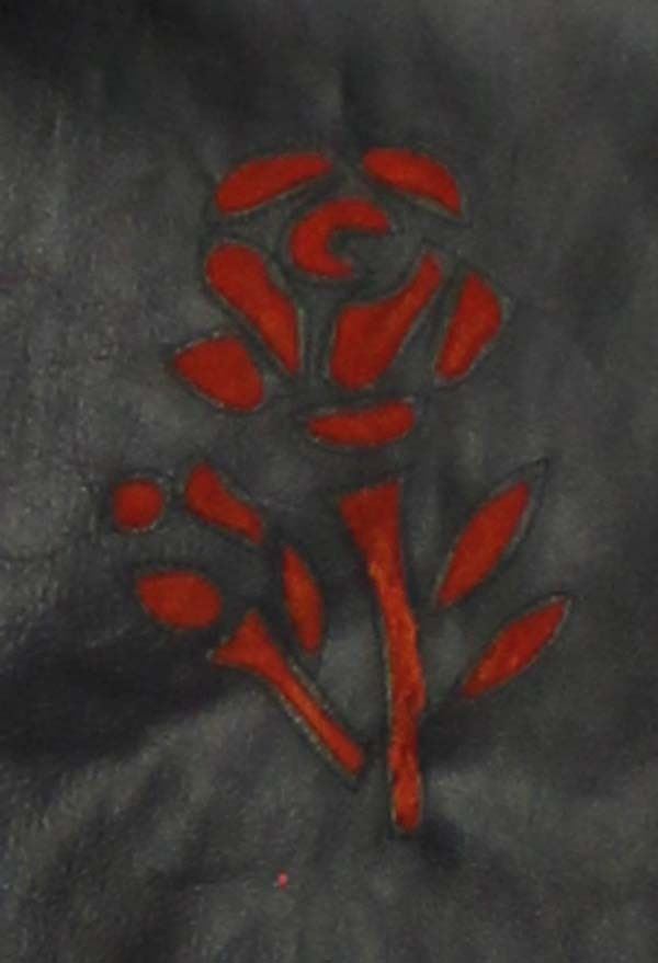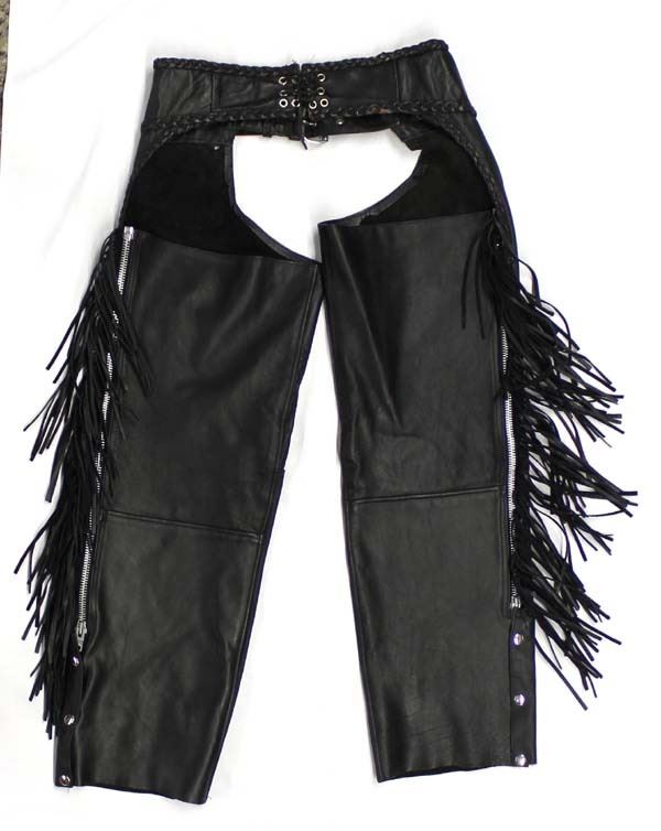 UNIK Fringed Leather Riding Chaps, size M, made in Pakistan, 30'' inseam, rose motif, leather is worn through on both stems of roses