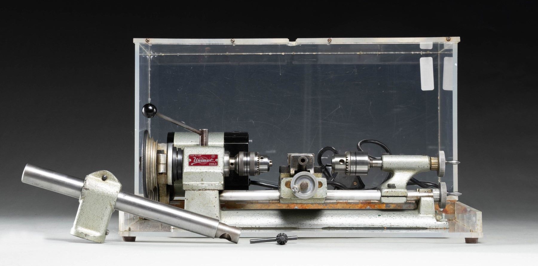 Lathe is made in Austria and its motor made in Holland. Voltage is 115, watts of 95, amps of .9 and 1/15 HP. Commonly used by jewelers and hobbiests for small delicate work. Includes desirable milling head and post that allows it to work as a milling machine. Drill chuck with key on tailstock. Drill chuck that can be finger tightened on head stock (missing chuck key). Has one 4mm round belt but is intended to operate with 2 belts utilizing its idler pulley to create a multitude of operating speeds. Belts readily available from outlets such as eBay. Many accessories are available from internet sources to increase its versatility. Encased in a plexiglass box to keep foreign matter from affecting its operation. All works smoothly and is in fine condition other that aged belts that surely need replacing. (02-25050-7/NW). NON-GUN. $300-450.