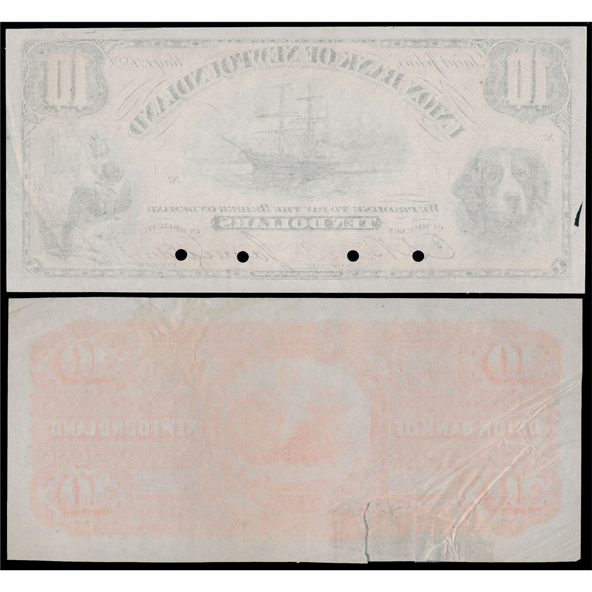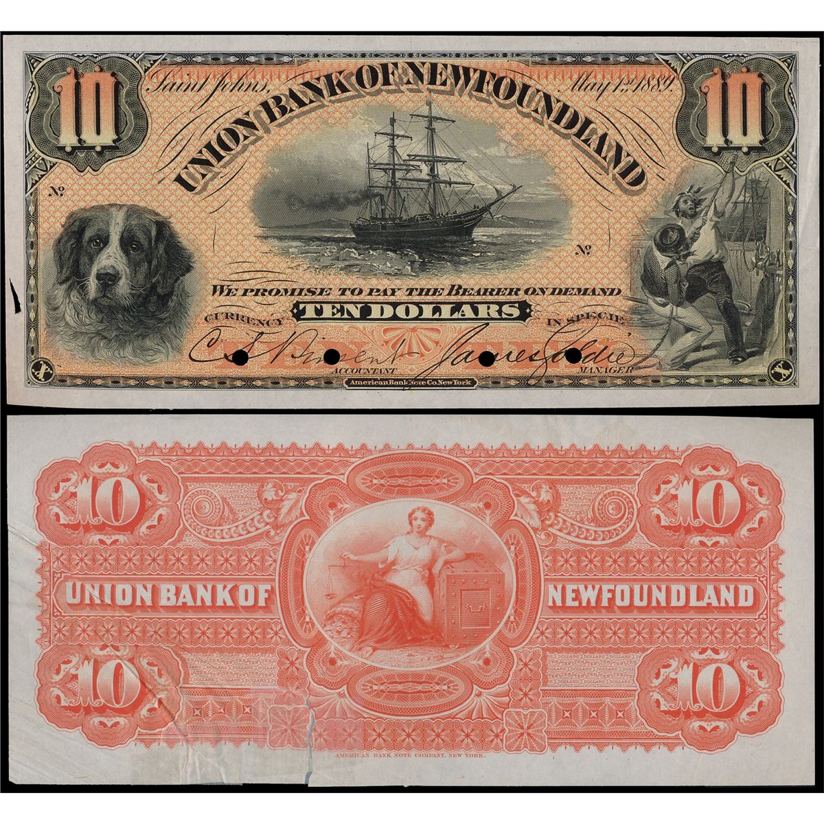 UNION BANK OF NEWFOUNDLAND. $10.00. May 1, 1889. CH-750-16-06P. Full colour Face and Back Proofs on thin paper. The back with light folding. Ex. MOORE's Oct. 27-29, 2005. Torex Auction sale. No. 1299.