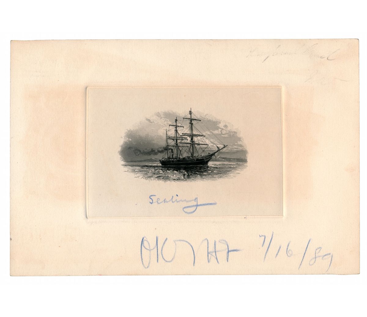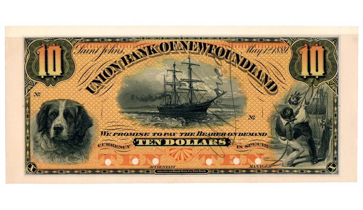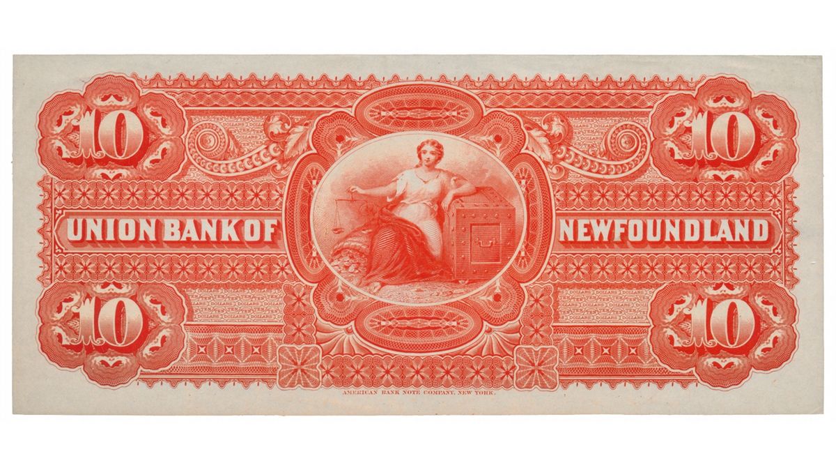 UNION BANK OF NEWFOUNDLAND. $10.00. May 1, 1889. CH-750-16-06P. Full colour Face and Back Proofs on cards. Also, a die Proof vignette of the 'Sailing Ship' that appears in the center of the proof. The vignette with approval initials and date 7/16/89.