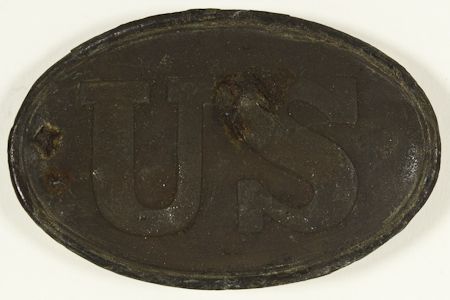 U.S. cartridge box plate, excavated, 3 3/8" long, loops on lead-filled verso, with three raised areas of oxidized iron coming through the face.