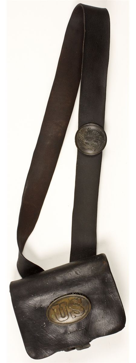 Original Union 1861 pattern leather cartridge box complete with sling and eagle plate, manufactured to accommodate forty .58 caliber minie ball cartridges. Bears fine original oval brass plate with the letters "US" embossed thereon, affixed to the box's flap with a strip of leather through the plate's loops. All straps, flaps and tabs are intact and strong. The interior pouch tab is also strong and intact, as is the tin compartment within. The pouch flap is maker marked "WILKINSON CUMMINGS MAKERS SPRINGFIELD, MASS". This cartridge box has been reconditioned and oiled and some of the preservative has coalesced to form some white residue. Sold as-is.