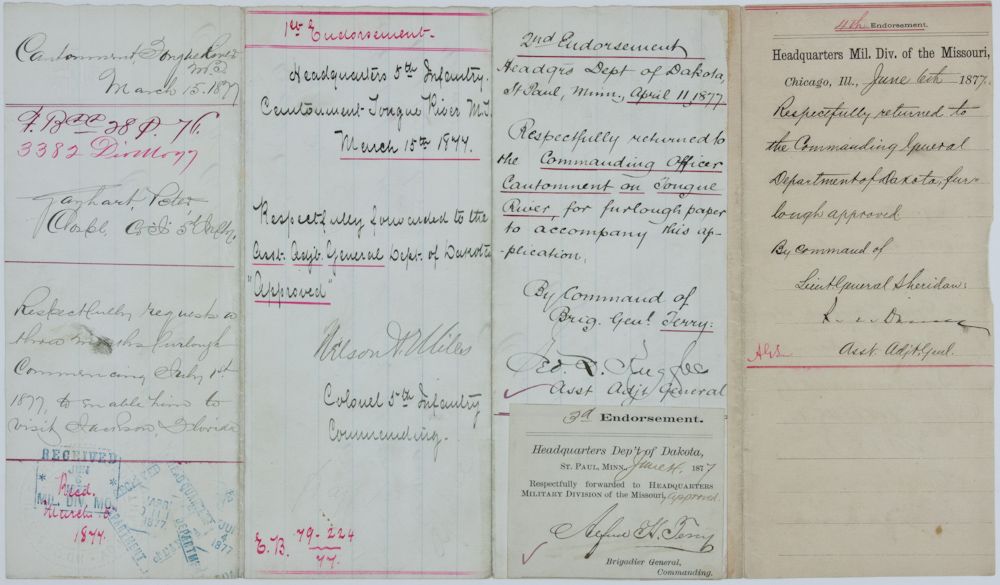 Manuscript L.S. 1p. legal folio, Cantamount, Mar. 15, 1877, a request for a furlough, endorsed on verso by; NELSON A. MILES, GEORGE RUGGLES (son of General George Ruggles), and with a separate third endorsement on a small sheet signed by ALFRED H. TERRY affixed beneath Ruggles' signature. A fourth endorsement from the Asst. Adjutant General of the Div. of the Missouri is also affixed. Very good condition.
