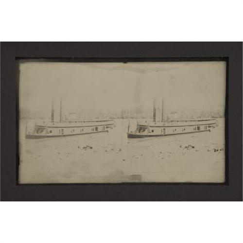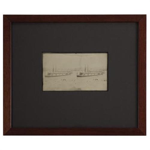 <B>UNION GUNBOAT ON THE UPPER TENNESSEE RIVER, 1864-65.</B></I> Federal Success at Chattanooga made it important to patrol the upper Tennessee River, and a number of small gunboats were built for that purpose. These little vessels were kept busily at work till the close of the war. All were named after the military leaders whose strategy had resulted in the recovery of Tennessee to the Union. This image published in F.T. Miller, The Photographic History of the Civil War, Volume VI, p. 233.<BR> <BR>Wet-plate glass negative - double lens exposure. Size, 5 by 8 inches. <BR>Probably taken by a Brady cameraman on the Tennessee River. Negative secured between protective glass covers and held in an archival frame, 12 by 14 inches.<BR><B><BR>Provenance:</B></I> See introduction to Brady images lot #72075<BR><BR><b>Shipping:</b> Framed - with Glass, Small (<a target="_blank" href="http://www.heritageauctions.com/common/shipping.php">view shipping information</a>)