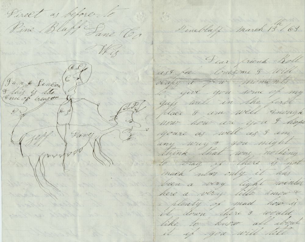 A.L.S. "B M Trevett" 4pp. 8vo., Pine Bluff, Wis., Mar. 13, 1863, to his friend, in part, "….there is nothing of importance to talk about but the draft & now I will tell you it makes these fellows squirm here to think of being drafted I think it would do some of them good to be placed in a nig[g]er regiment & be put on short al[l]owance at that for some of there [sic] meanness but I think old [Abe?] will tend to them…" After complaining of high prices, Trevett adds to a cartoon on the final page-a crude drawing of Lincoln (with a hat marked "AL") riding a female horse marked "J[eff] D[avis]" (and again on the body, "Jeff Daves[sic]") with Lincoln exclaiming: "I am A. Lincon & this is the end of treason." Light soiling at creases, else very good.