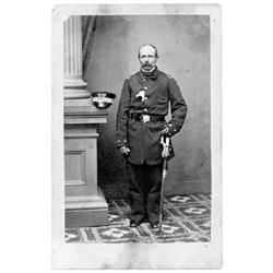 <b>790. UNION NAVAL OFFICER CDV </b>A war-date CDV showing a Union naval officer holding his sword, dressed in a regulation navy uniform with handkerchief stuck between the buttons of his frock coat. His naval cap with fouled anchor sits on the pedestal beside him. Pendleton's, N.Y. backstamp. Some minor soiling and spotting to image, with some creases and edge wear to mount, overall good condition.<b>$100-150</b>
