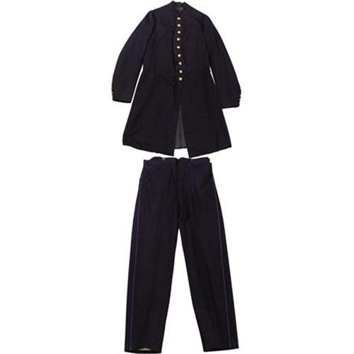 <B>UNION OFFICER "CAPT. BYRON PARSON'S" 94th NEW YORK INFANTRY FROCK COAT AND PANTS WITH SHOULDER STRAPS-WOUNDED AT GETTYSBURG.</B></I> In standard issue blue wool, this Union officer's frock coat and pants are in exceptional condition. The dark green interior lining is intact although worn, particularly in the area where the sleeve linings are attached. All buttons are present and are the spread eagle design with the infantry āIā in the center. The coat is accompanied by the soldier's Smith patent shoulder straps and matching trousers. A light blue welt down the outside seam of each leg denotes rank. There is little deterioration to the cloth and virtually no moth damage to either piece. <BR><BR>This uniform was owned by Captain Byron Parsons of the 94th New York Volunteers who was wounded at the battle of Gettysburg, July 1st, 1863. Parsons survived only to be captured later at Weldon Railroad, serving time as a prisoner of war at Libby Prison in Richmond, Virginia. An account of his time there from Jan. 1, 1864 to October 14, 1865, can be found in <I>Civil War Manuscripts : A Guide to Collections Manuscript Division of the Library of Congress.</B></I> Byron Parson survived Gettysburg, one of the costliest of battles for the N.Y. 94th and rose to the rank of major. <BR><BR>This lot was originally purchased from the family and comes with a significant amount of family background and information. One note of interest is the large size of the uniform as Parsons was a giant man of some six feet tall.<BR><BR><b>Shipping:</b> Clothing, Costumes & Jerseys (<a target="_blank" href="http://www.heritageauctions.com/common/shipping.php">view shipping information</a>)