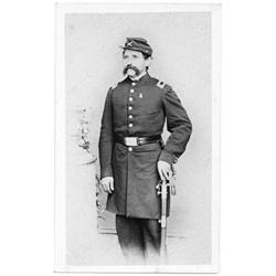 A great CDV of an artillery first lieutenant standing with a sword. He wears a kepi with an artillery insignia on the front and a small medal hangs from his frock coat. Backstamp of Worms, New York studio. Near fine.