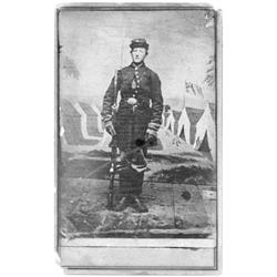 A great CDV of a full standing Civil War soldier holding his rifle with bayonet in the "Order Arms" position. He is wearing gloves and tall boots, suggesting that he was a sharpshooter. Behind the soldier is a camp scene backdrop with an American flag flying. No backstamp, but a pencil inscription states "From Toledo, Oh. and Evansville, In. album". Minor edge wear with some mount loss, light soiling and toning, else very good.