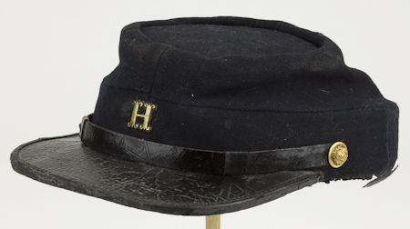 Dark blue broadcloth kepi, 2 1/2" tall at front, 3 1/2" tall at back, 1 3/4" black leather visor reinforced at edge, brass eagle buttons with a brass "H" affixed at front. Cinched thin white cloth liner with cardboard headliner stiffener, leather sweatband torn in places, just a few tiny moth holes, else very good.