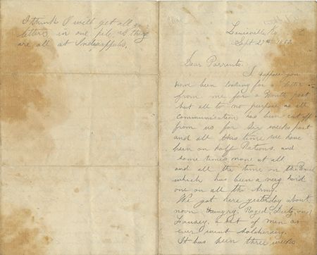 A.L.S. of Union soldier John Thomas Louisville, Ky, Sept. 27, 1862, to his parents in Cincinnati, in pencil. He writes, in part: "...I suppose you have been looking for a letter from me for a month past, but all to no purpose as all communication has been cut off from us for six weeks past and all this time we have been on half Rations and sometimes none at all and all the time on the march which has been a very hard one...We got here yesterday about noon hungry, ragged, dirty and lousy a set a men as ever went soldiering. It has been three weeks since we had a change of clothes and there is no telling when we will have one as our Regimental Train is all behind with our knap sacks and cooking utensils...We are camped on the strip of ground between the river and canal and no body allowed to go in the town here...Bragg is reported to be within thirty miles of this place in force, I only hope it is so and that he has made up his mind to attack us immediately for I am tired of running after him...I have no idea how long we will stay here nor when we will go...P.S. Gen. Ammon commands our brigade, and Gen Smith, the Division...". With original envelope bearing embossed "Union and Constitution" seal on verso. Soiled yet very legible and overall very good condition.