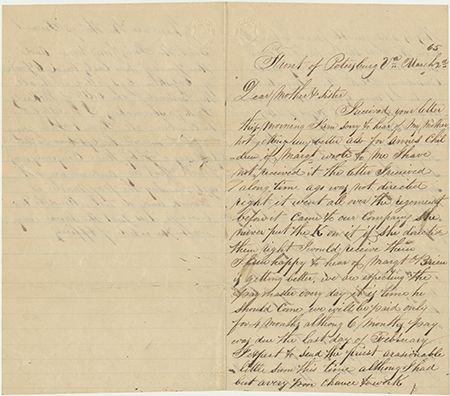 Pair of war-date Union soldier's letters written by Pvt. Timothy O'Sullivan, 1st Connecticut Heavy Artillery, to Astoria, Connecticut, 2pp. "Front of Petersburg, VA, January 27, 1865", in part: "I wrote to you a few days ago about a pass…no one will get one unless they show it is a case of sickness and by you doing as I said to have Doctor Terry go and see my mother and himself write to me so I could show it. I think I could get a furlough on the strength of it…the furloughs are granted for only 15 days…"; the second letter, 3pp., is written "Front of Petersburg, VA, March 2, 1865", in part: "…We are expecting the paymaster every day. It is time he should come, we will be paid only for 4 months, although 6 months pay was due the last day of February… They say the pay master is drunk and does not attend to his business…I expect to send the priest a reasonable little sum...This is a disagreeable place when it rains…We are in the greatest hopes of this being the last summer of the war...". Very good.