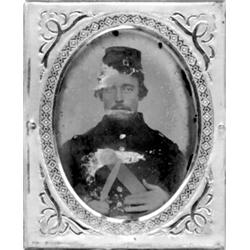 (UNION SOLDIER WITH BOWIE KNIFE): Great 1/9th plate ambrotype of a Union private wearing a state issue shell jacket with epaulettes, cartridge box sling, and kepi. The soldier holds across his chest a bowie knife for the camera, and his buckles and buttons were gilded for effect by the photographer. Image is housed in a full, but cracked, thermoplastic case and is protected by a brass mat, frame and glass. Solarization and minor scratches affect image, else very good. $200-300