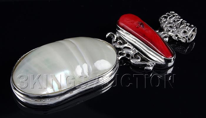 UNIQUE 15.28GRAMS MOTHER OF PEARL SILVER PENDANT **|**|** 2.90 INCHES UNIQUE DESIGN MOTHER OF PEARL SILVER PENDANT WITH RED CORAL GEMSTONE ; MSRP: $300