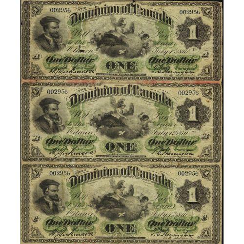 UNIQUE 1870 $1 UNCUT SEET of 3 notes; DC-2a 1870 $1 Montreal, Small date. The notes grade Fine or better, a few nicks. A museum piece. Of the highest rarity!