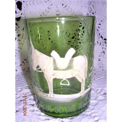 Rare and unique "Pride of the West" Donkey Tumbler. Mary Gregory-type application. Inscribed "Pride of the West." This piece has come down through my family as a "1898 Trans Mississippi Exposition piece"(?). Beautiful emerald green color glass with applied ivory/white donkey. Ground bottom. Measures 3.75 high and 2.75 inches wide at the top rim. Excellent condition. We carefully pack and double box all of our fine glassware.
